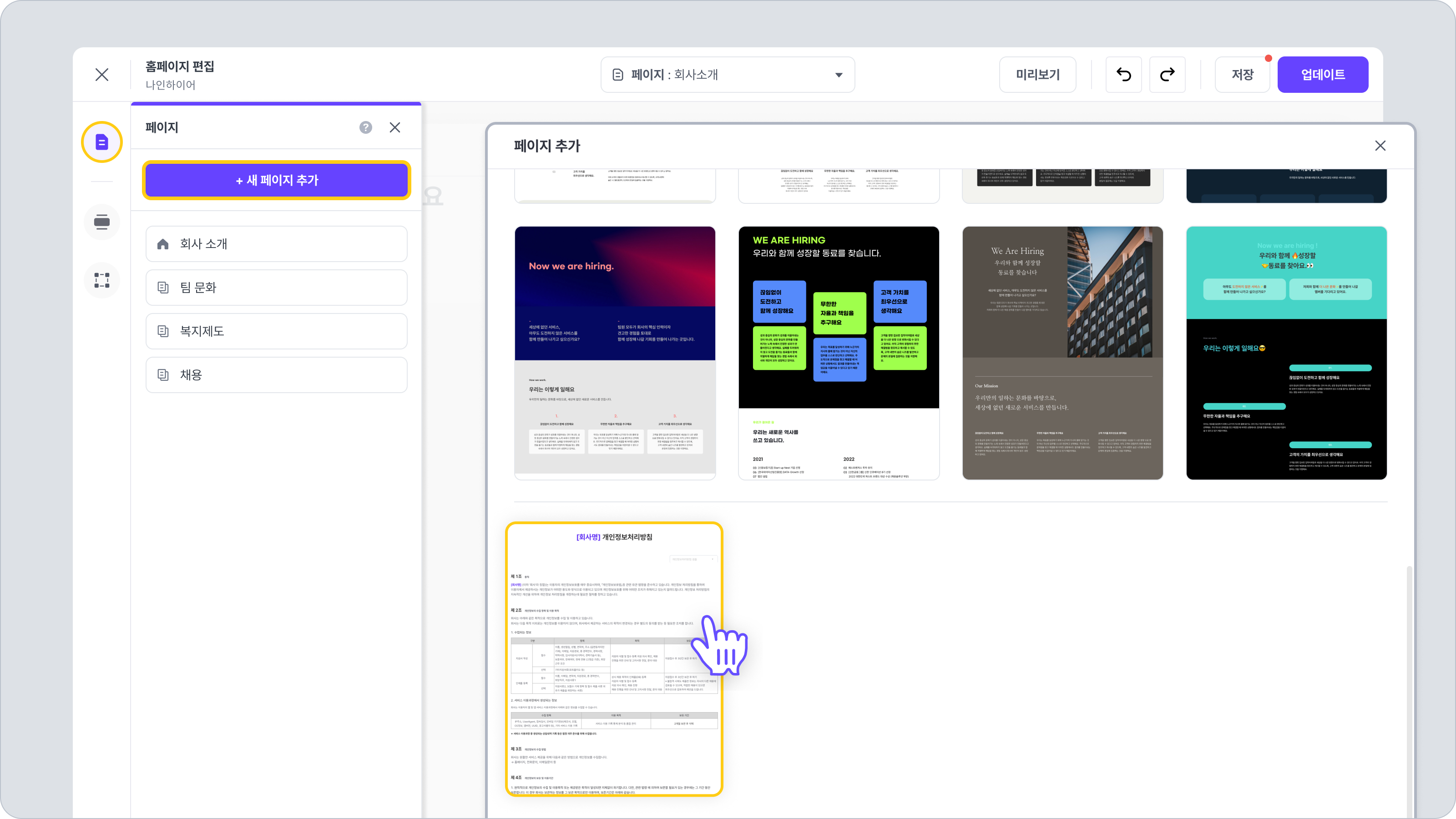 [경로: 채용 홈페이지 편집 > 페이지 추가 > 개인정보처리방침 페이지 선택]