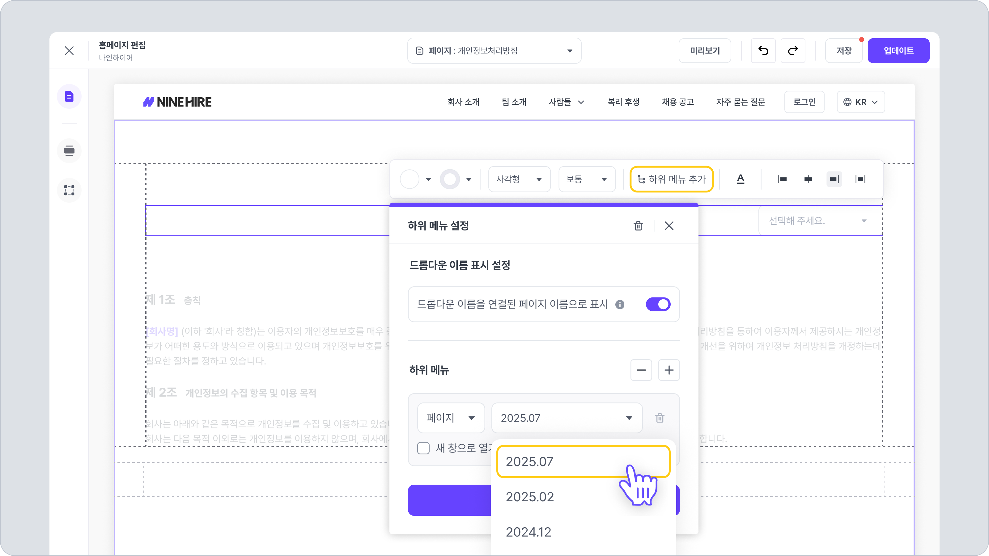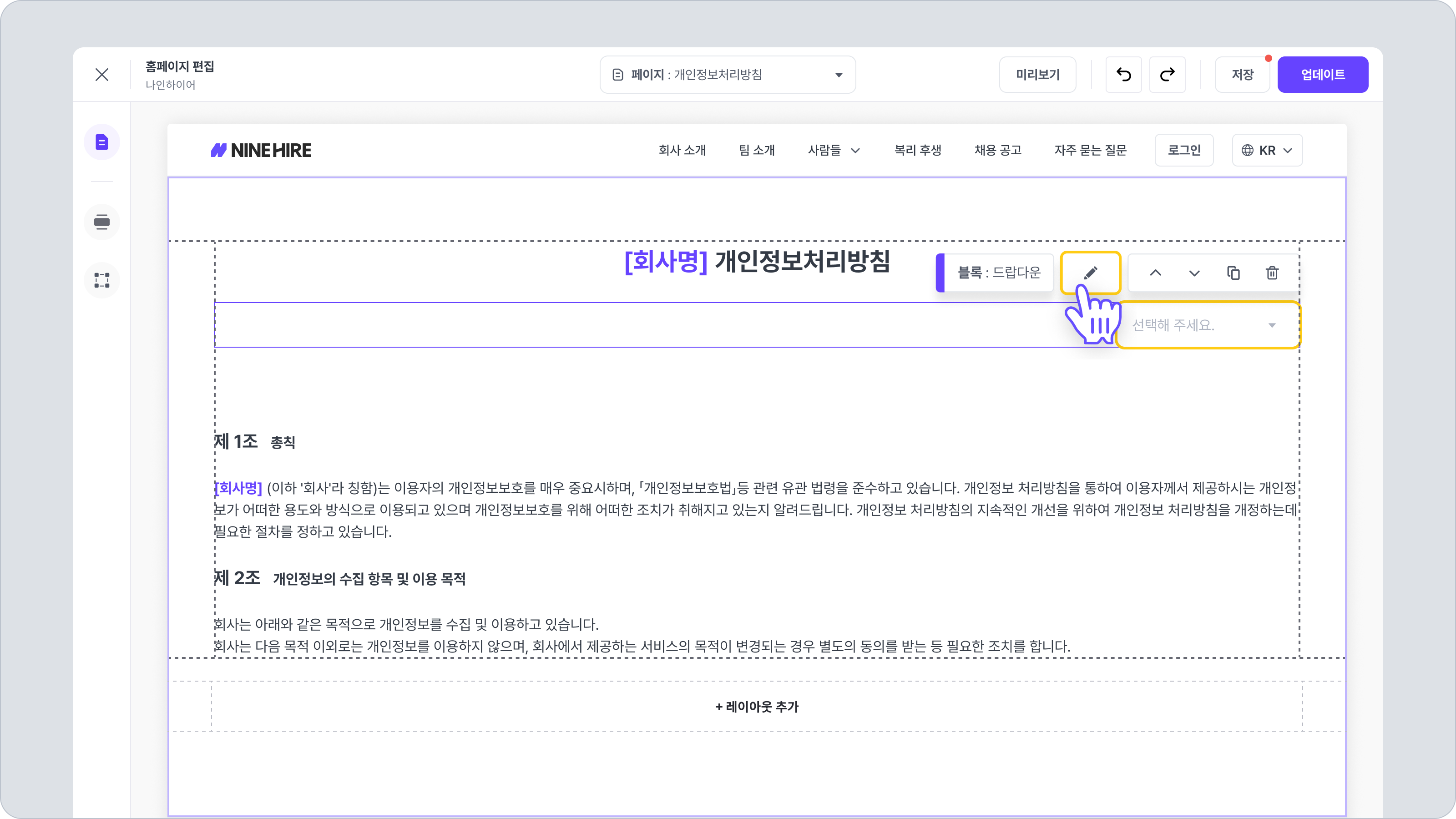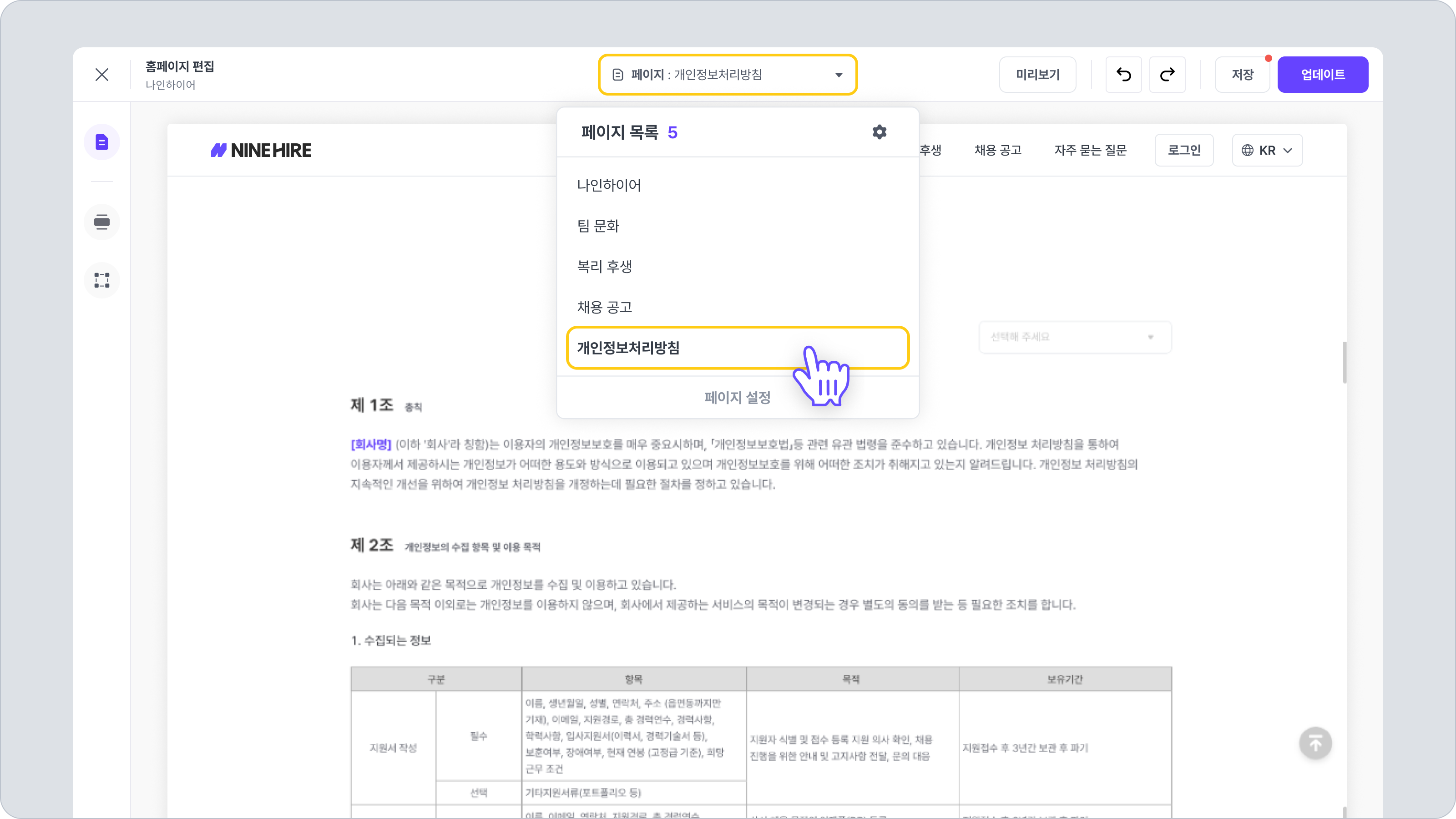 채용 홈페이지 편집 화면 중앙 상단의 드롭다운 메뉴를 통해 생성한 [개인정보처리방침] 페이지로 이동해 주세요.