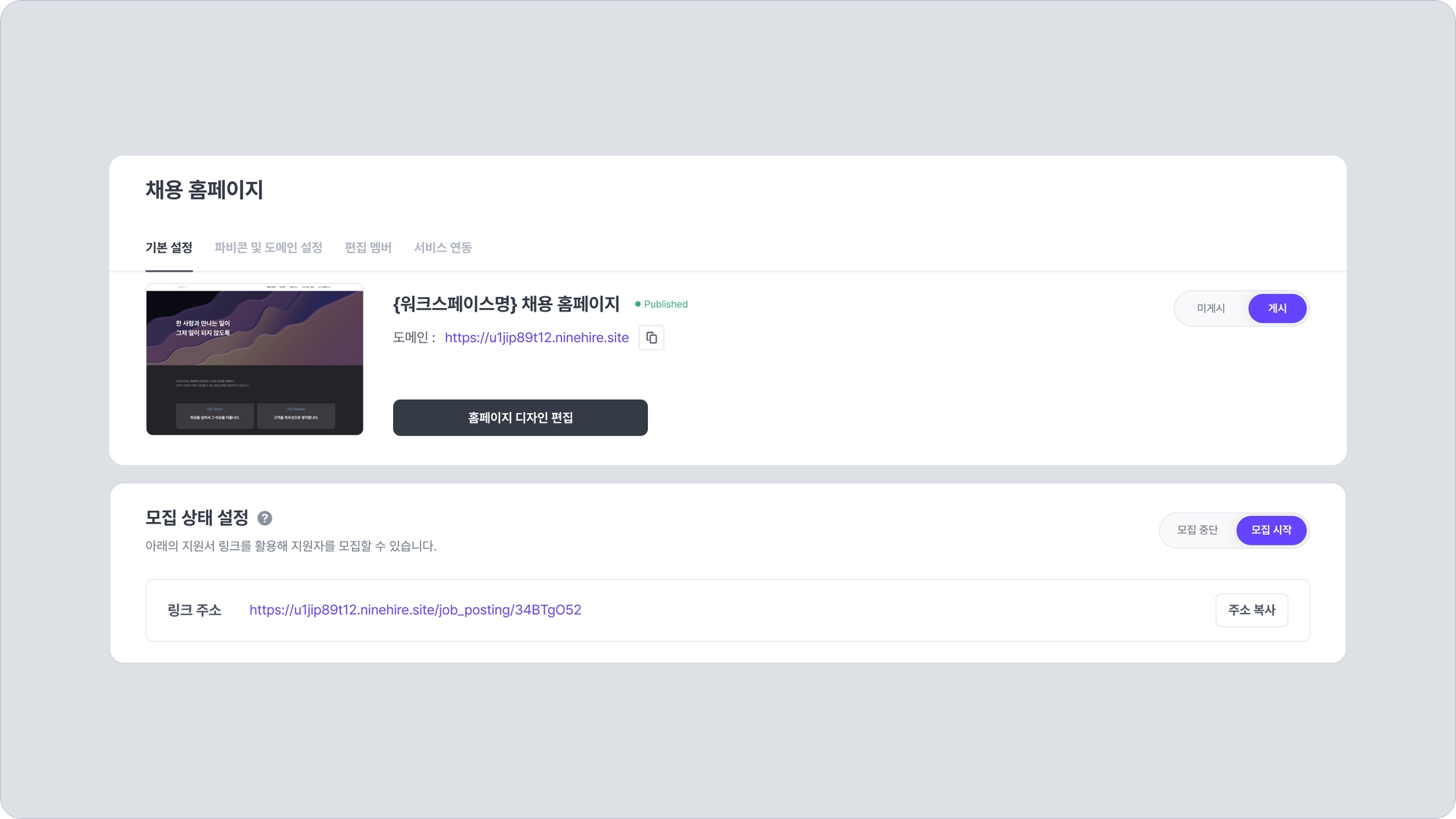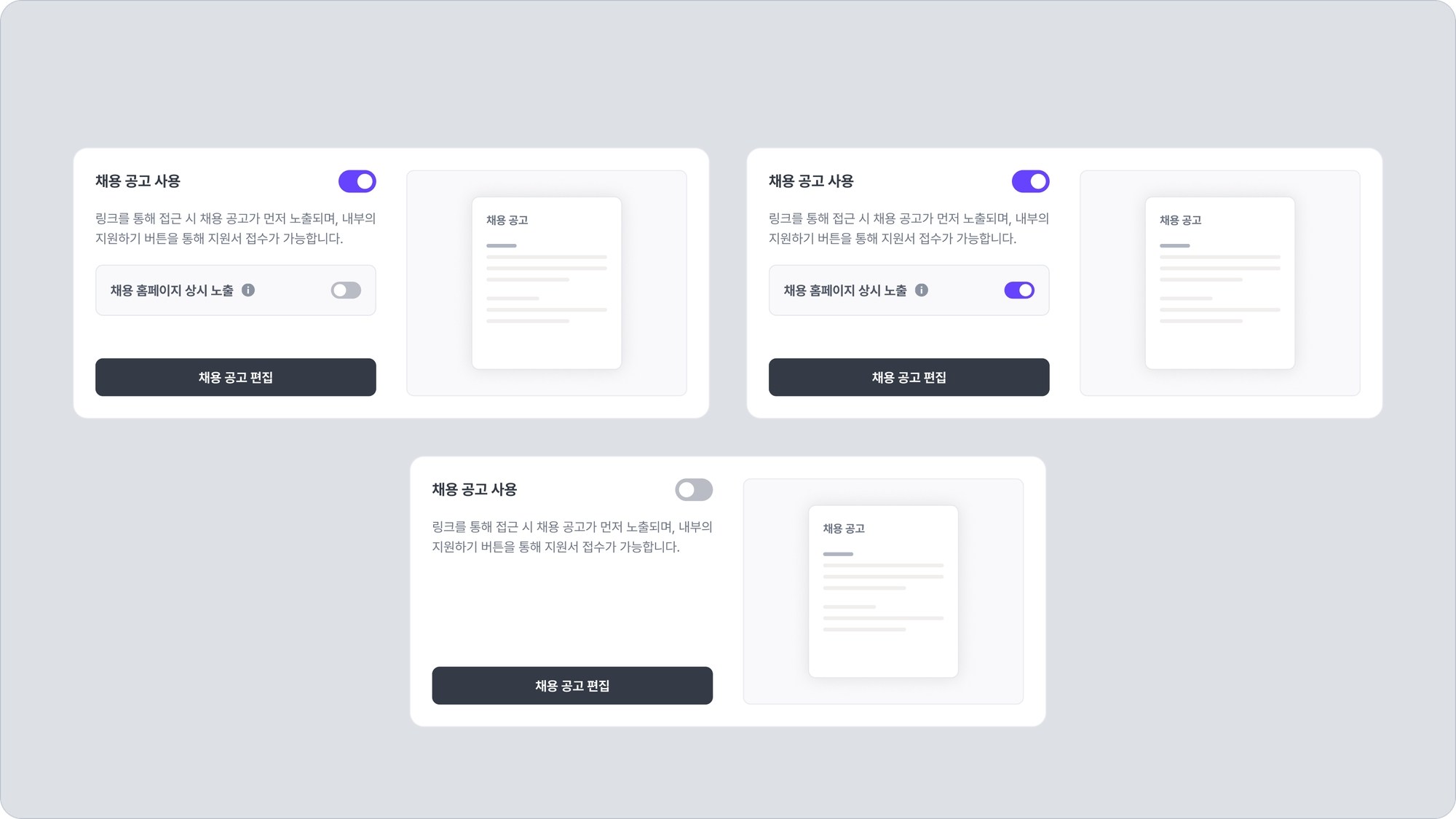 크게는, 채용 홈페이지나 모집 상태가 어떠한지, 채용 공고를 사용하는지, 홈페이지 상시 노출이 켜져 있는지 등에 따라 미리보기가 변경되어 제공됩니다.