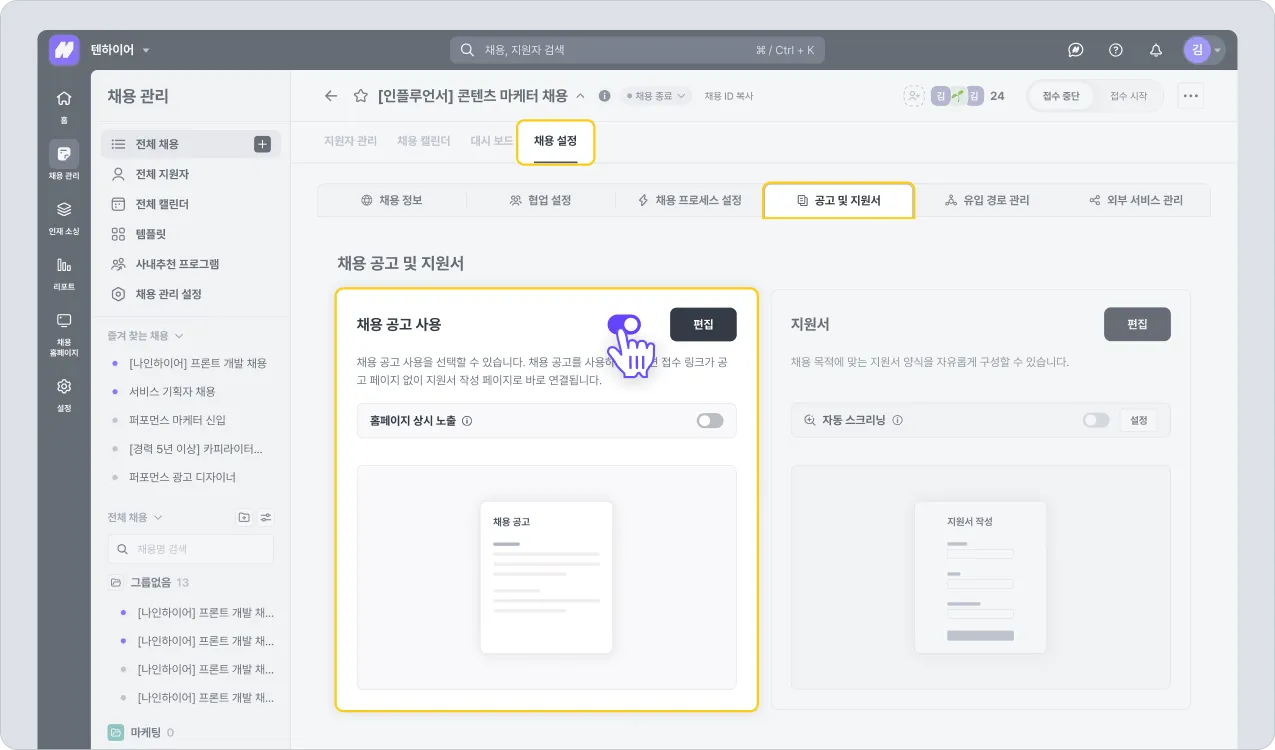 ■ 채용 공고 사용 여부 설정 경로: 채용 관리 > 개별 채용 > 채용 설정 > 공고 및 지원서 > 채용 공고 사용