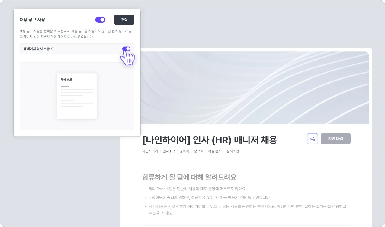 [채용 공고 사용]을 활성화하면, 채용 홈페이지 상시 노출을 설정할 수 있게 됩니다. 채용 홈페이지 상시 노출을 활성화하면 채용이 종료되거나 모집 상태가 [모집 중단]으로 설정되더라도 지원자에게 채용 공고 페이지가 노출됩니다. 단, 지원서 작성 페이지로는 이동할 수 없으며 버튼에 [지원 마감]이 표시됩니다.