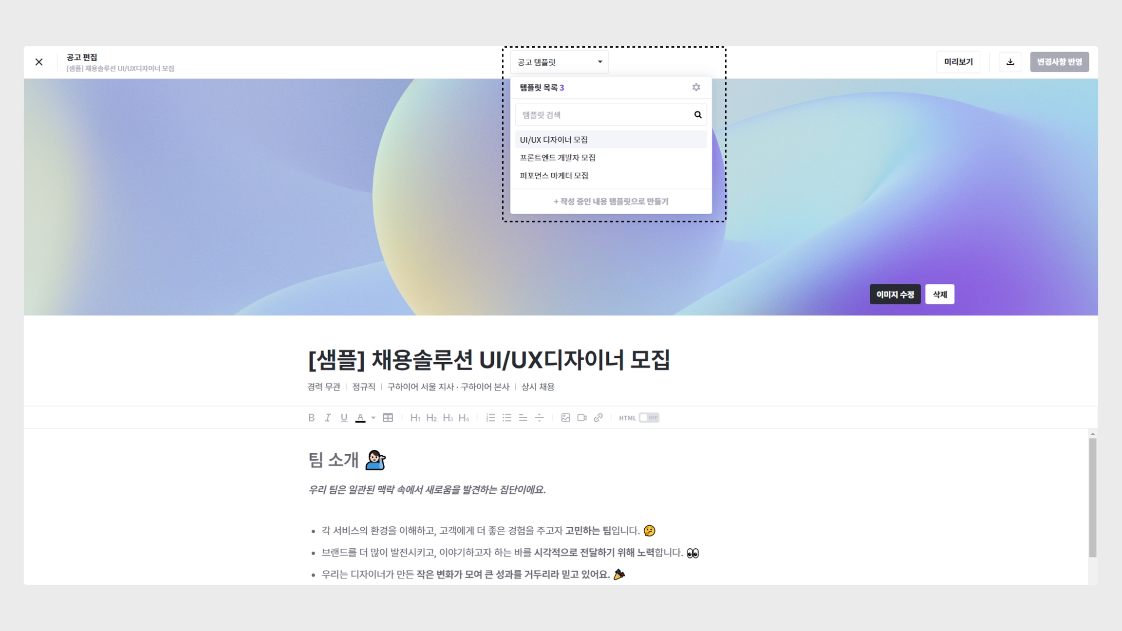 저장된 공고 템플릿은 각 채용별 공고 편집 페이지에서 불러와 사용할 수 있습니다.