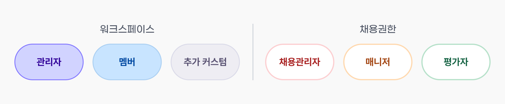 워크스페이스에서의 권한은 [관리자, 멤버, 추가 커스텀 권한(멤버 권한과 유사)], 채용에서의 권한은 [채용 관리자, 매니저, 평가자]로 나뉘어요.