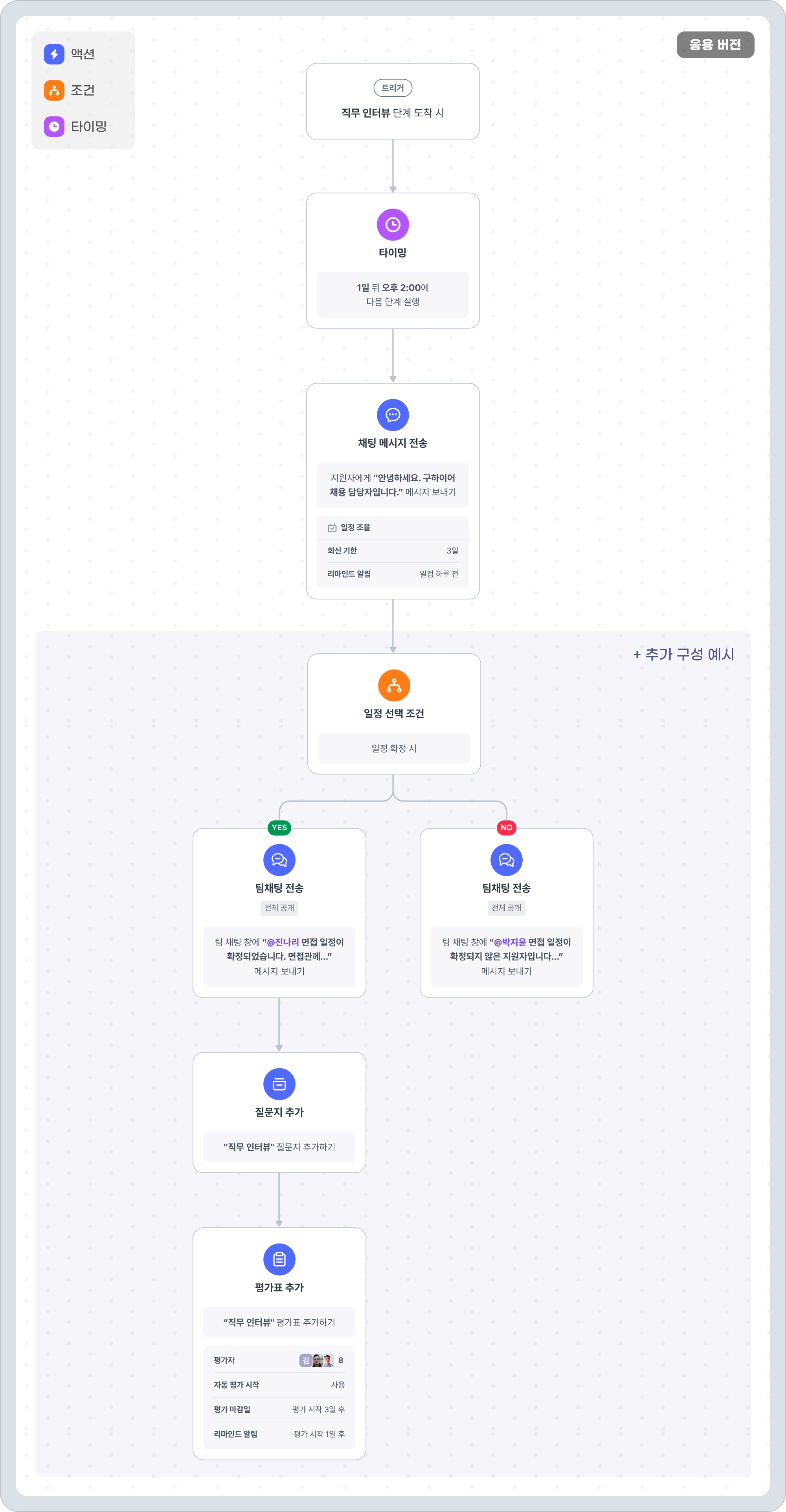 YES 분기에는 "팀채팅 전송 액션"을 추가하여 예정된 면접관에게 일정이 확정되었음을 알리고, 면접을 준비할 수 있게 합니다. 면접 질문지와 평가표도 동시에 추가하여 면접 준비를 돕습니다.