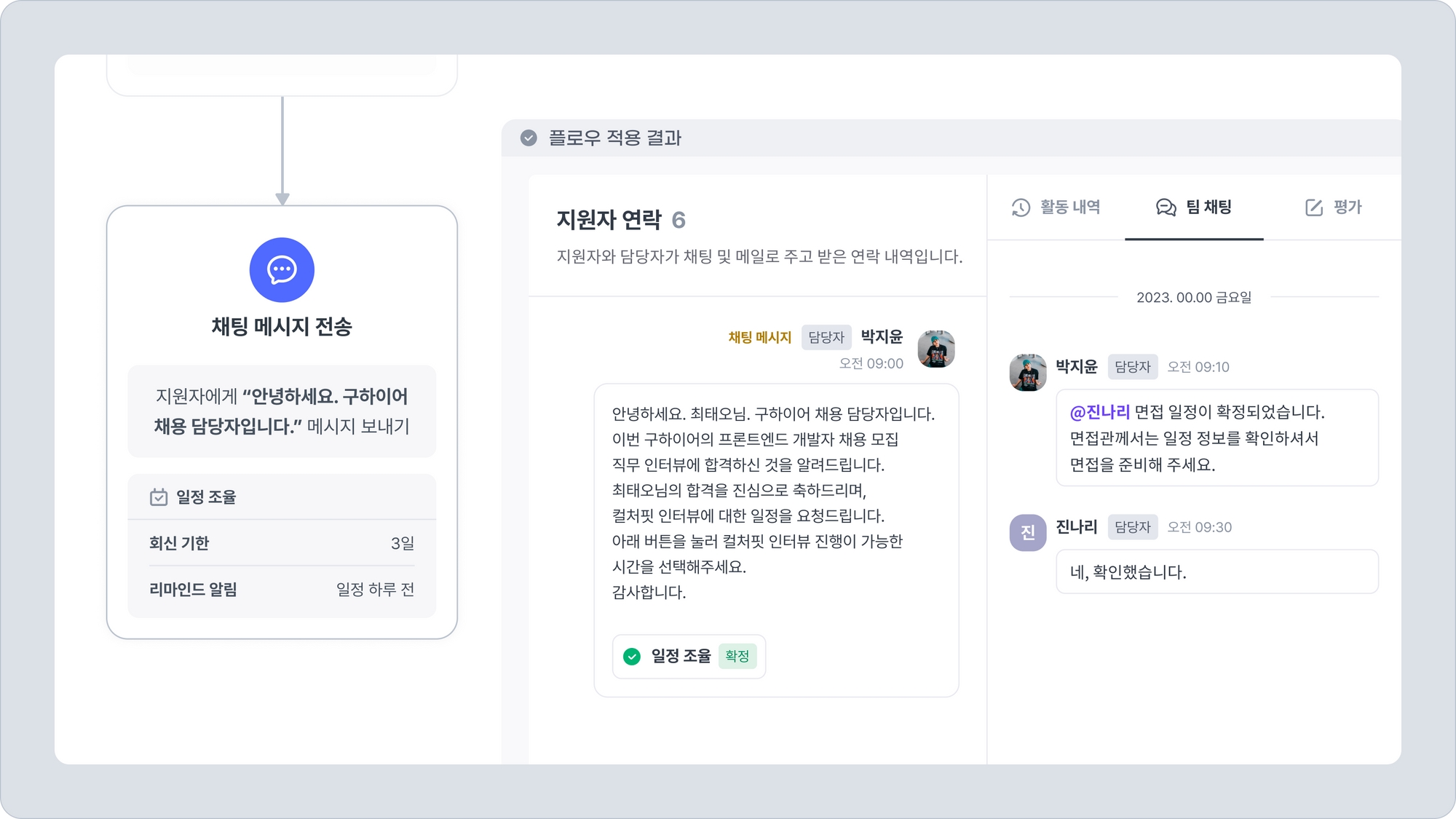 지원자에게 면접 단계를 안내하고, 면접 일정을 조율하는 것도 자동화할 수 있습니다.