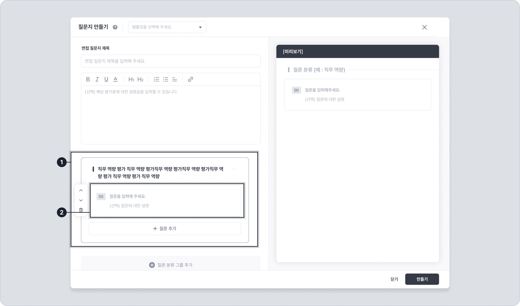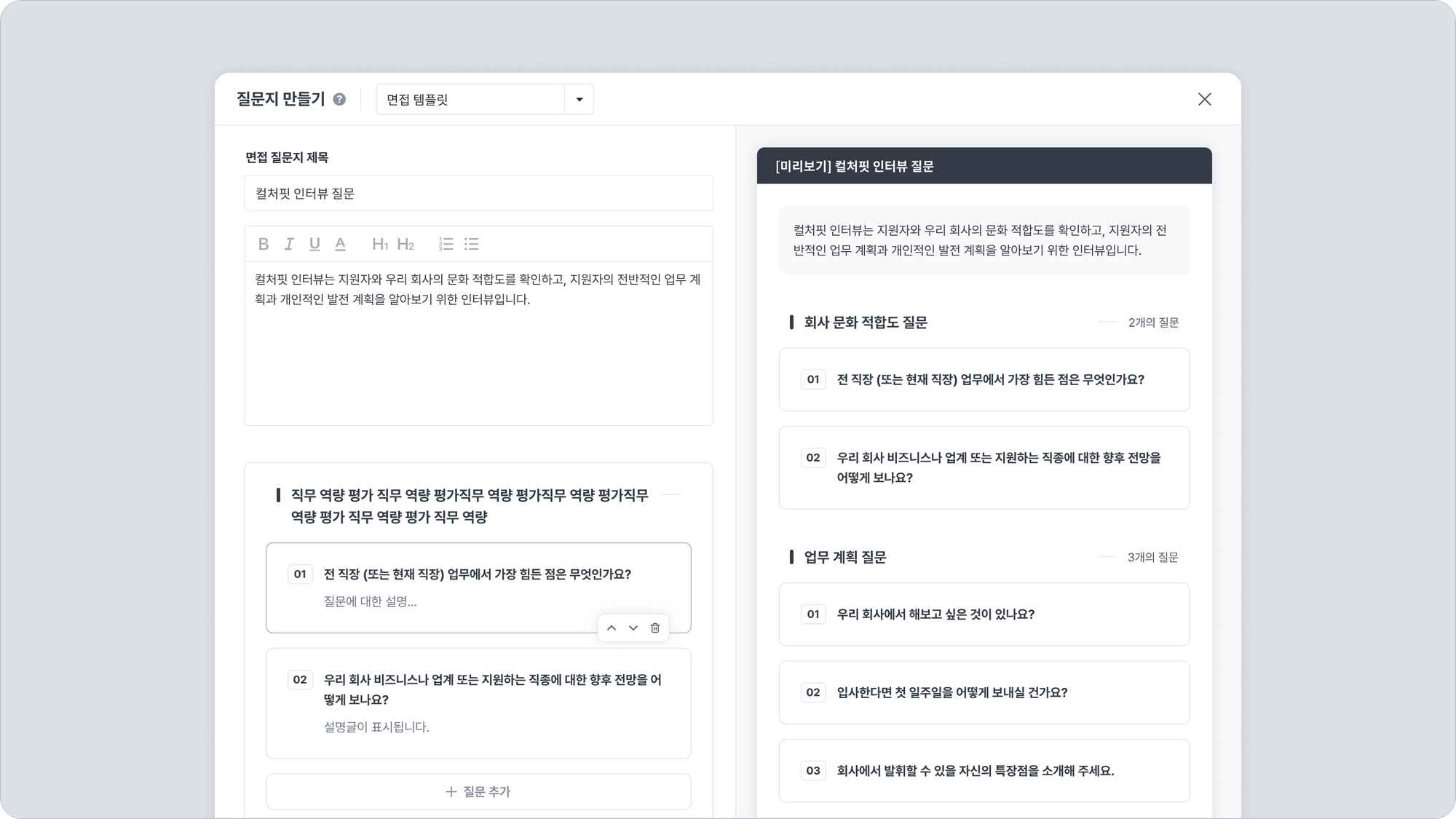 면접 제목과 면접 질문지 전체에 대한 설명, 각 질문의 분류와 질문을 알맞게 입력합니다.