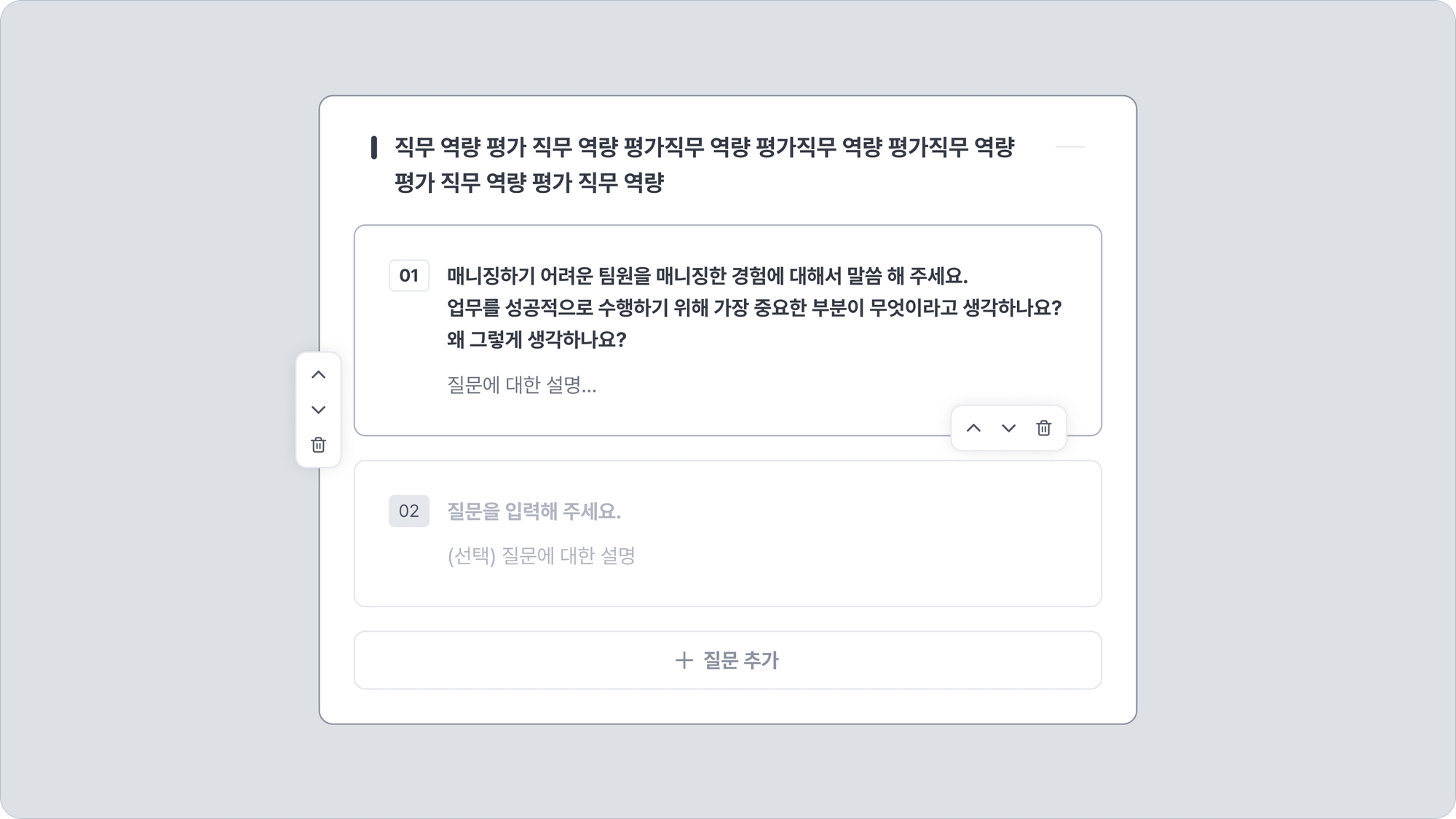 질문 분류나 각 질문 항목은 순서 변경이나 삭제가 가능합니다. 호버 시에 관련된 버튼이 활성화됩니다.
