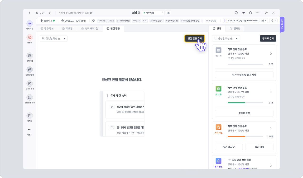 지원자 상세 화면 > 면접 질문 탭에서 우측 상단에 위치하고 있는 [면접 질문 추가] 버튼을 클릭합니다.