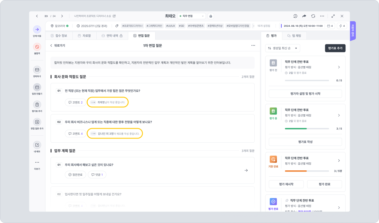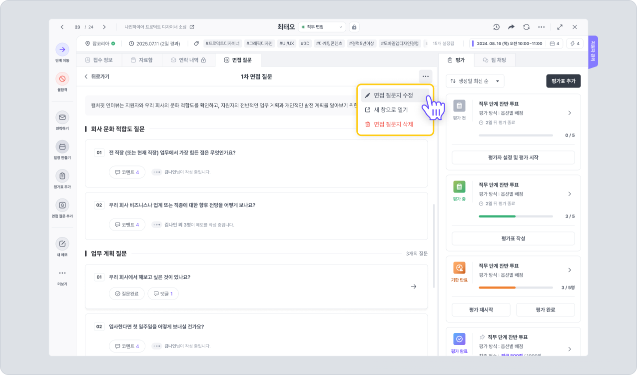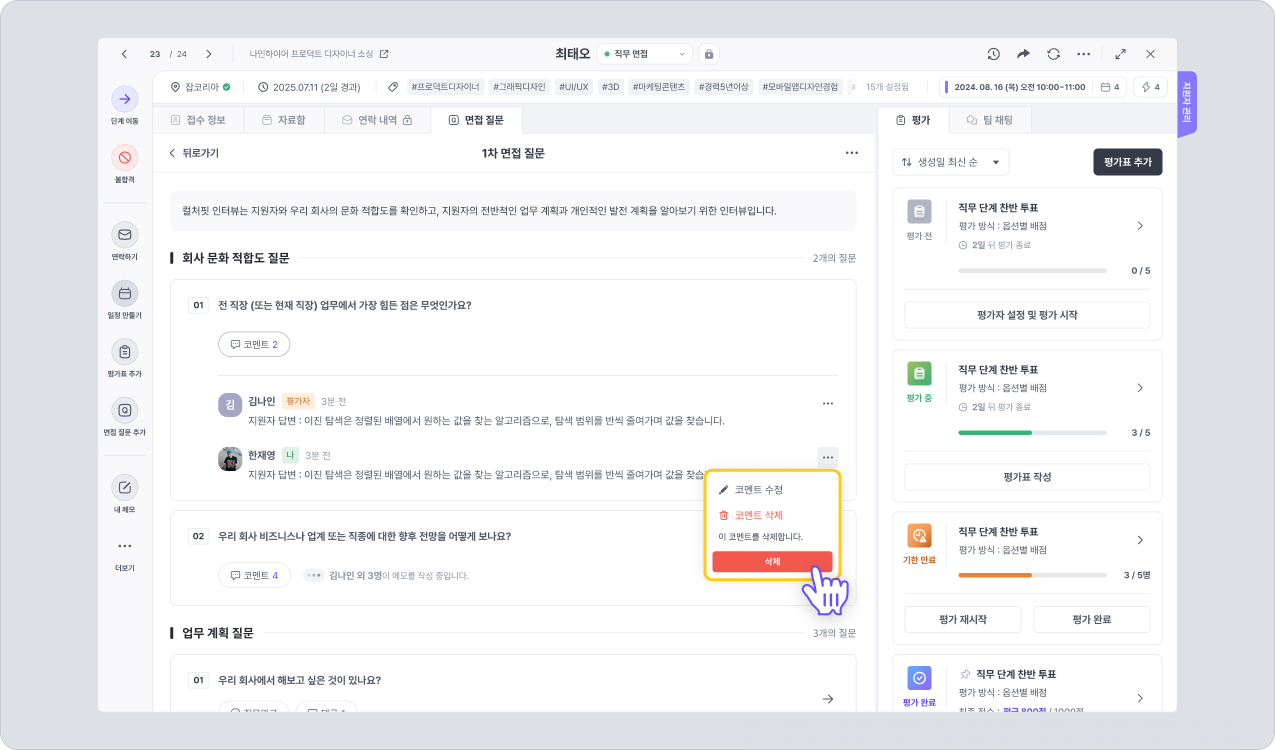 면접 질문지의 코멘트 기능을 활용하여 지원자의 답변을 기록하거나, 면접관으로서 의견을 남길 수 있습니다. 만약 준비된 질문을 바꾸어 질문했다면, 바꾼 질문과 그에 대한 대답을 함께 기록할 수도 있습니다.