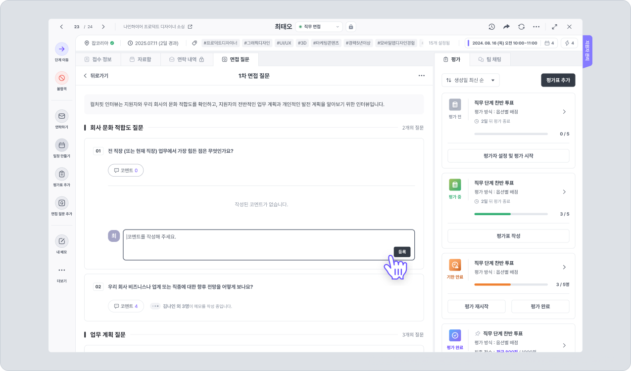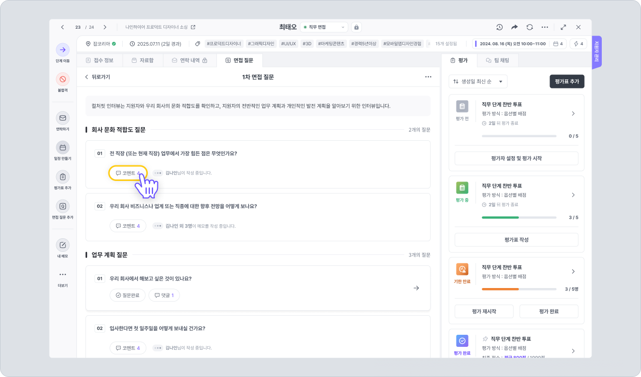 면접 질문 내 각 질문 아래에는는 코멘트를 추가할 수 있는 버튼이 나타납니다.