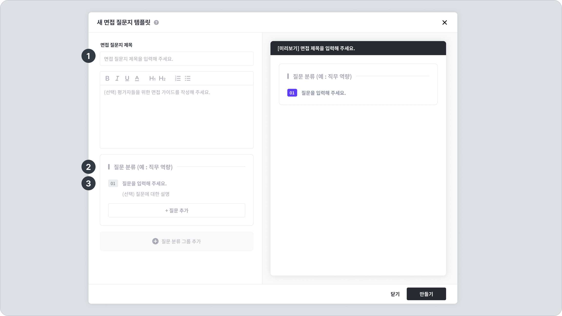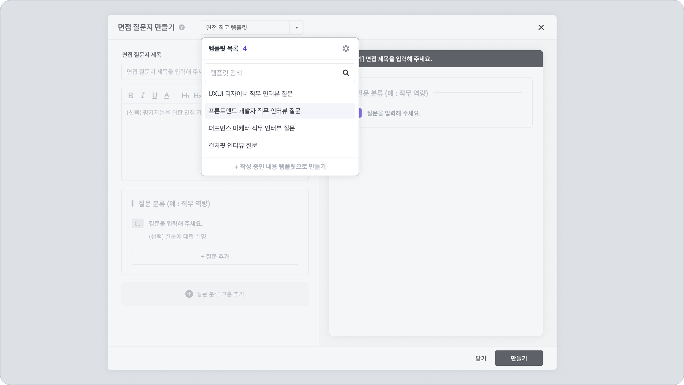 새 면접 질문 템플릿 창에서 면접 질문 템플릿을 만듭니다.