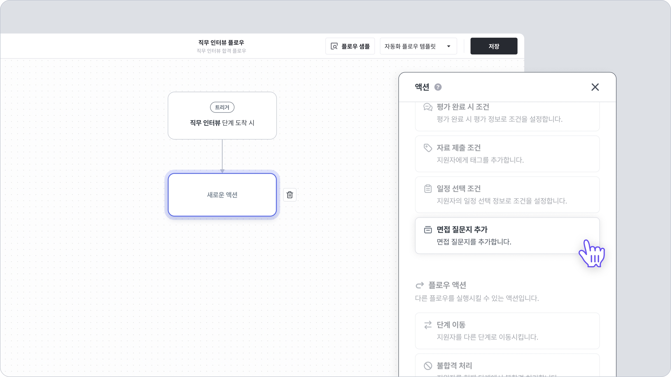 단계 도착 시 면접 질문 자동 추가 액션을 사용할 때에도 템플릿을 불러와 활용할 수 있습니다.