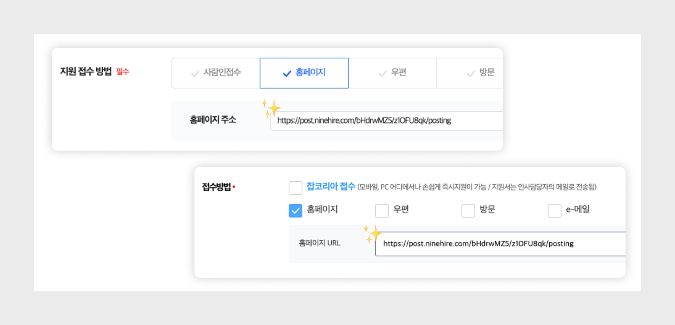 다른 접수 방법들은 모두 선택 해제해야 모든 지원자의 정보가 나인하이어로 모이게 됩니다.