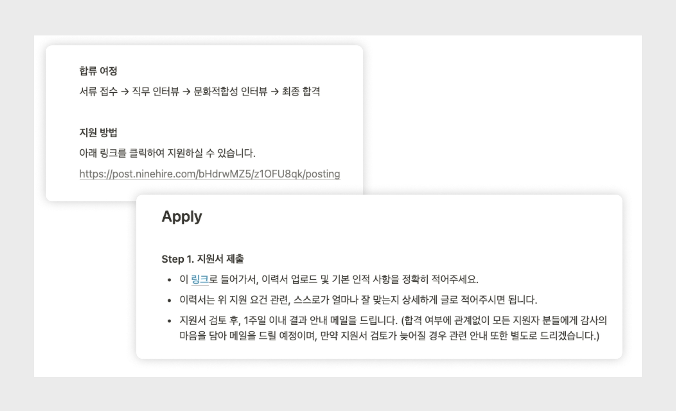 지원 방법에 링크를 직접 붙여넣거나 하이퍼링크로 연결하여 나인하이어 모집 링크를 지원자에게 제시합니다.