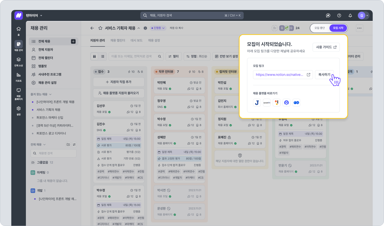 외부 플랫폼에 채용 공고를 홍보하기 위해 모집 링크를 붙여 넣을 수 있습니다.