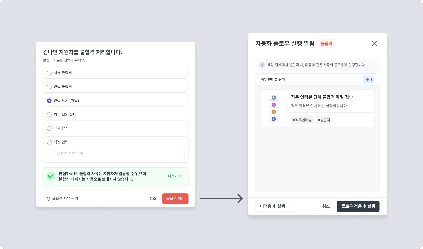 또한, 해당 단계에서 불합격 처리 시 설정된 자동화 플로우가 있다면 이에 대한 알림이 제공되며 취소, 미적용/적용 후 실행 중 하나를 선택할 수 있습니다.