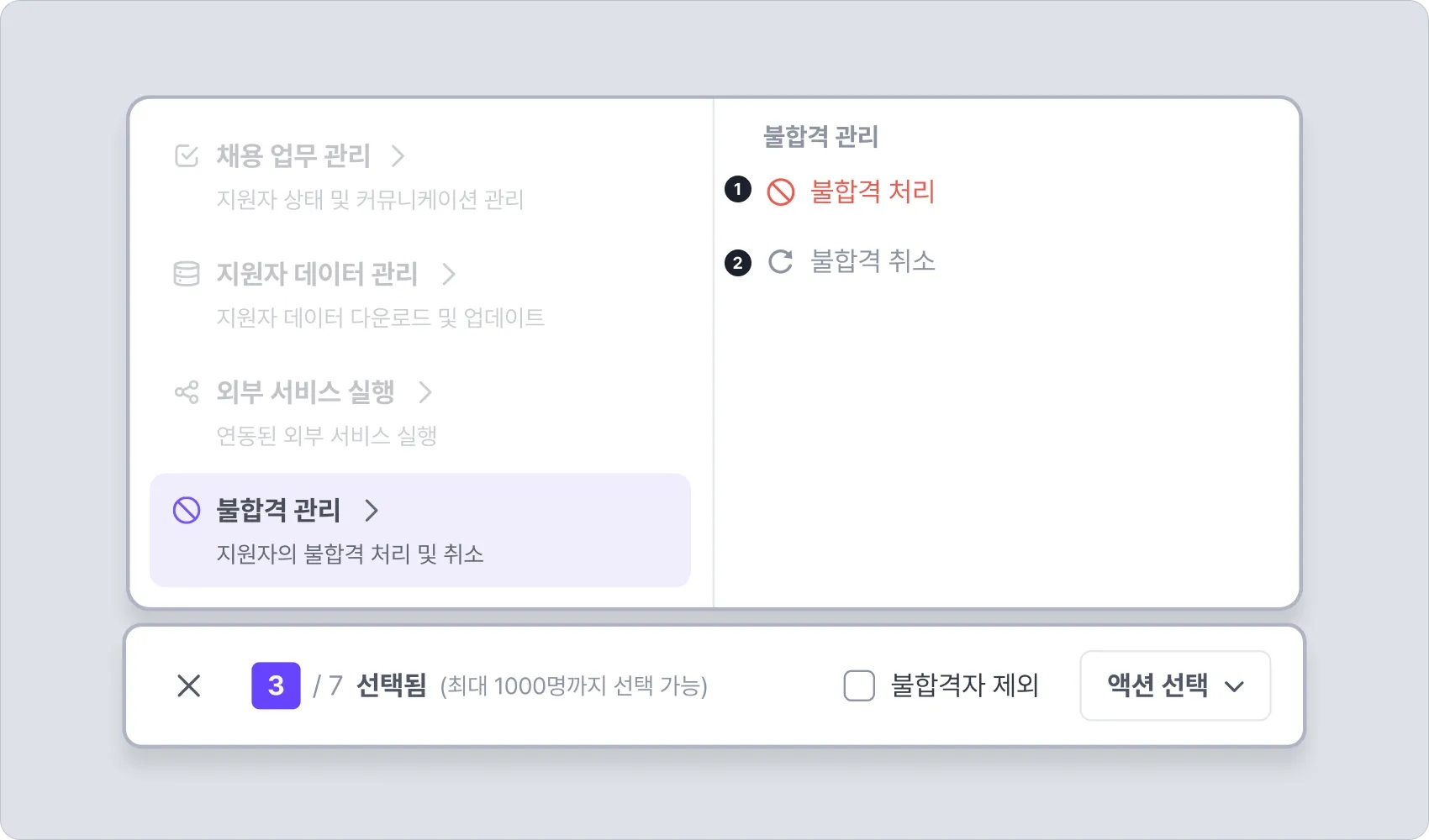 단, 지원자 다중 선택 후 "불합격자 제외" 체크 박스의 선택을 해제해야 액션 선택이 가능합니다.