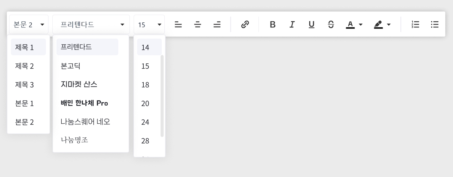 텍스트 스타일 : 제목 1, 2, 3 / 본문 1, 2