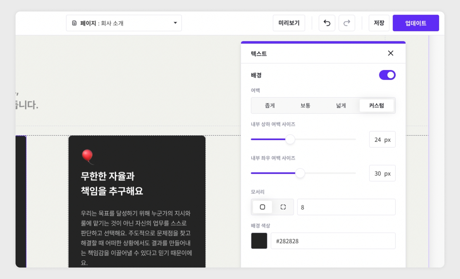 여백 : 배경의 여백 크기 설정 (내부 상하/좌우 여백 사이즈 설정 가능)
