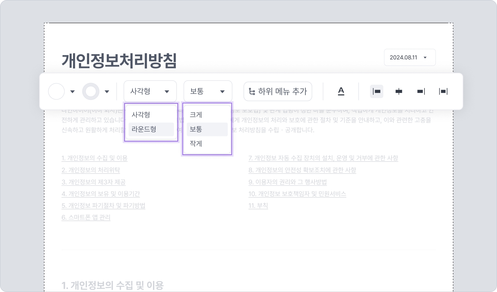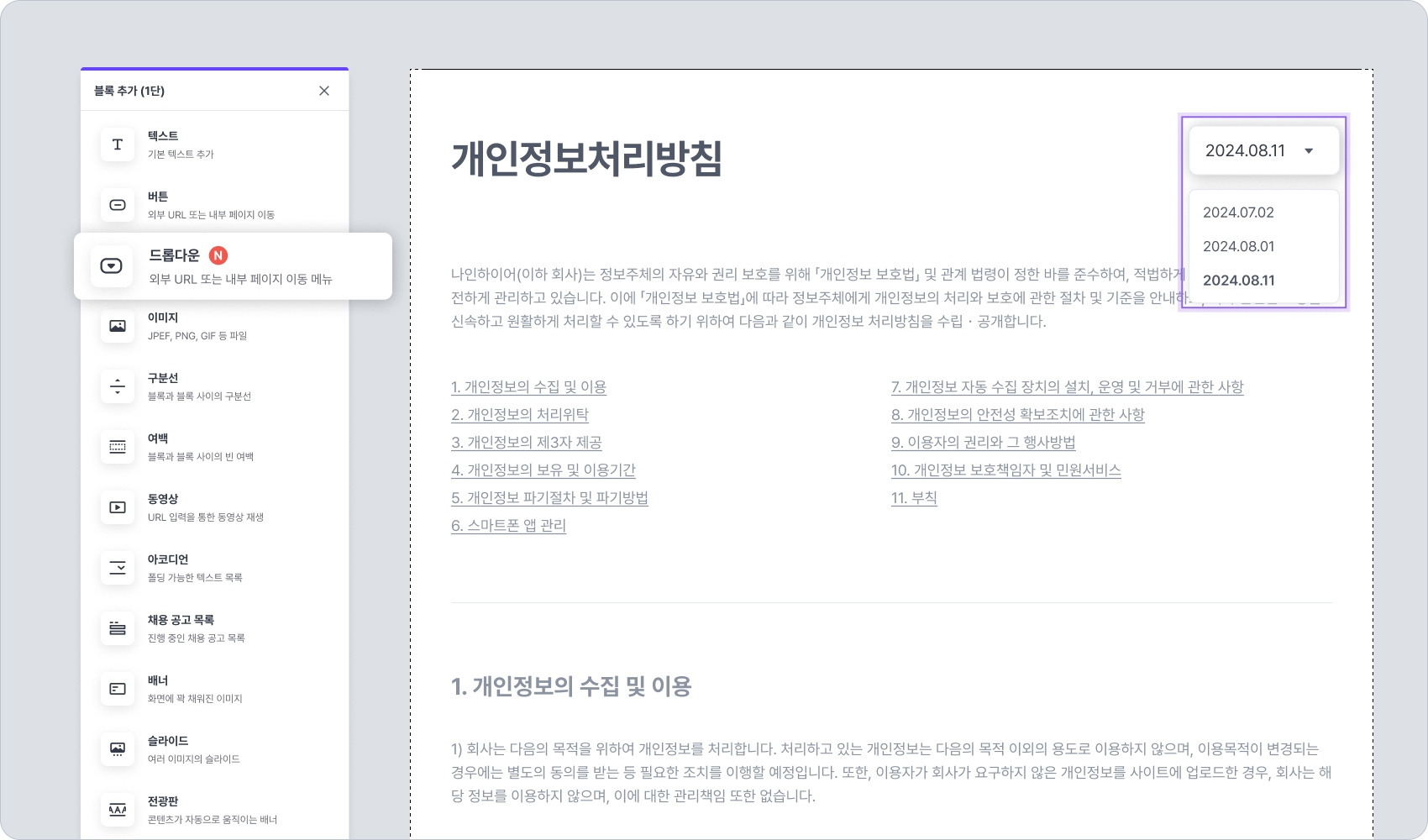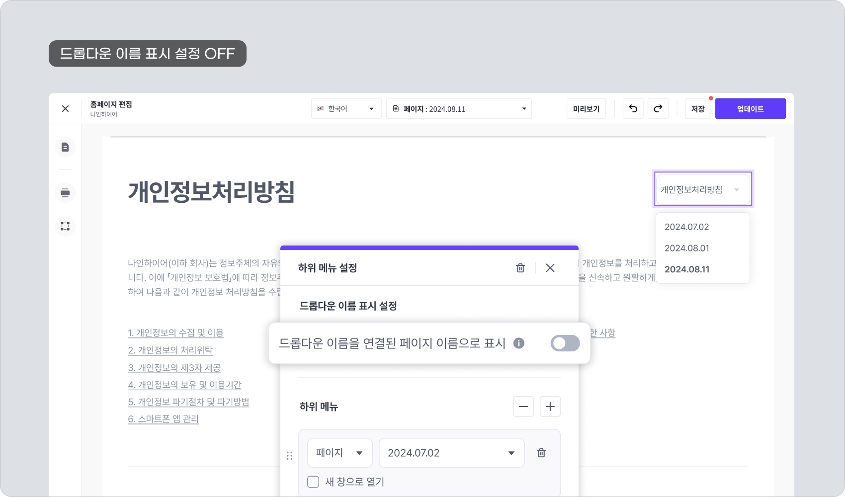 "드롭다운 설정 - 드롭다운 이름을 연결된 페이지 이름으로 표시" 옵션을 끄면, 드롭다운 블록에 설정한 이름이 드롭다운을 열기 전의 버튼 이름으로 표시됩니다. (위 예에서는 "개인정보처리방침") 그리고, 이 드롭다운 버튼을 클릭하여 열면 하위 메뉴에 설정한 값들이 선택 가능한 옵션으로 표시됩니다.