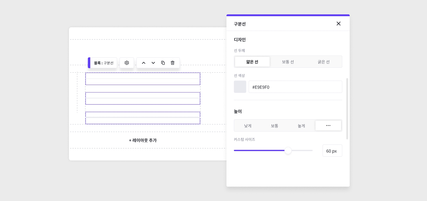 높이 : 낮게, 보통, 높게, 커스텀 (구분선이 차지하는 세로 영역의 높이)