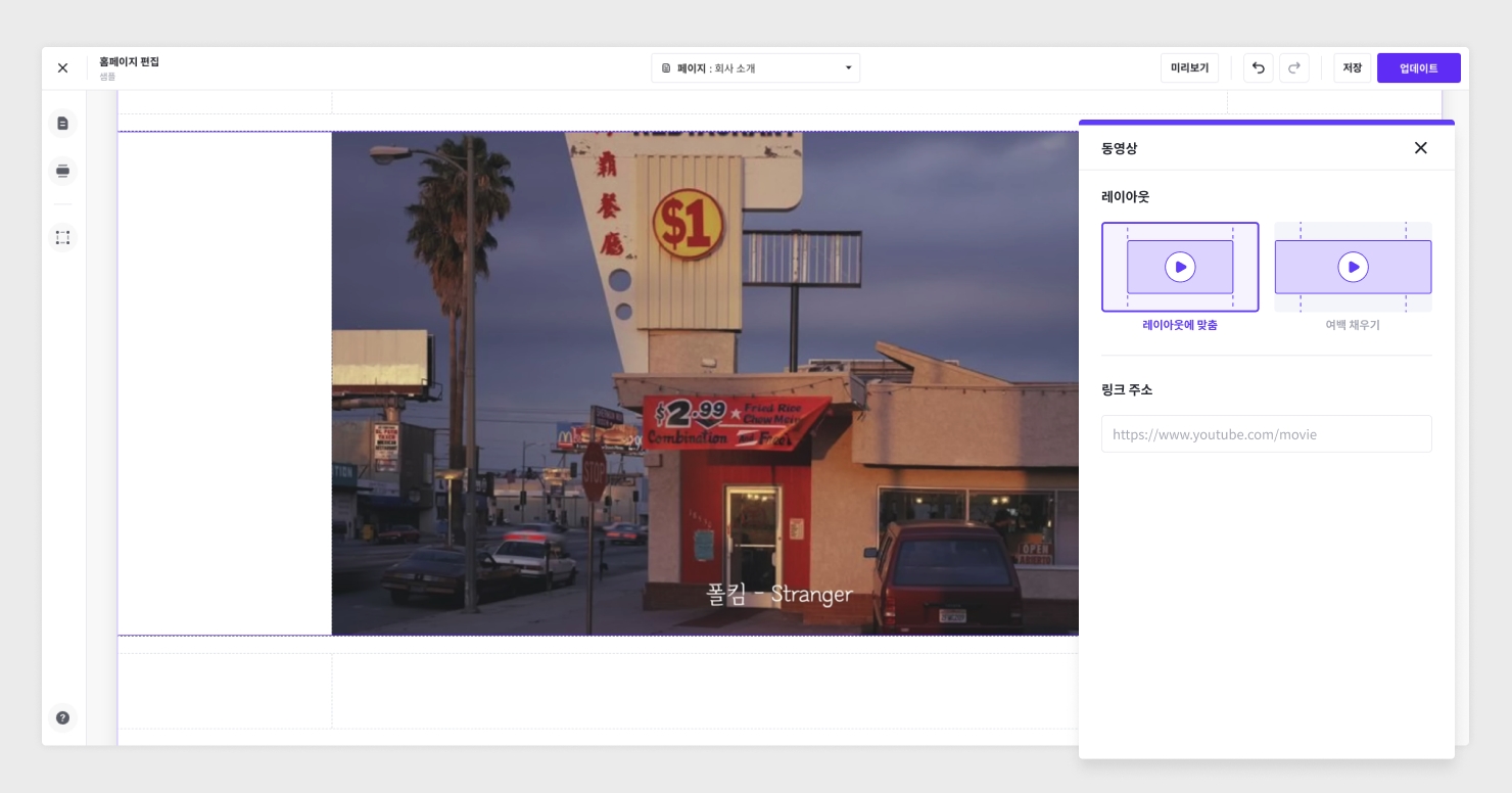 설정을 클릭하여 링크 주소를 입력하는 방식으로 동영상을 첨부합니다. 설정을 통해 동영상을 레이아웃에 맞추거나 여백을 채우는 방식으로 구성할 수 있습니다.