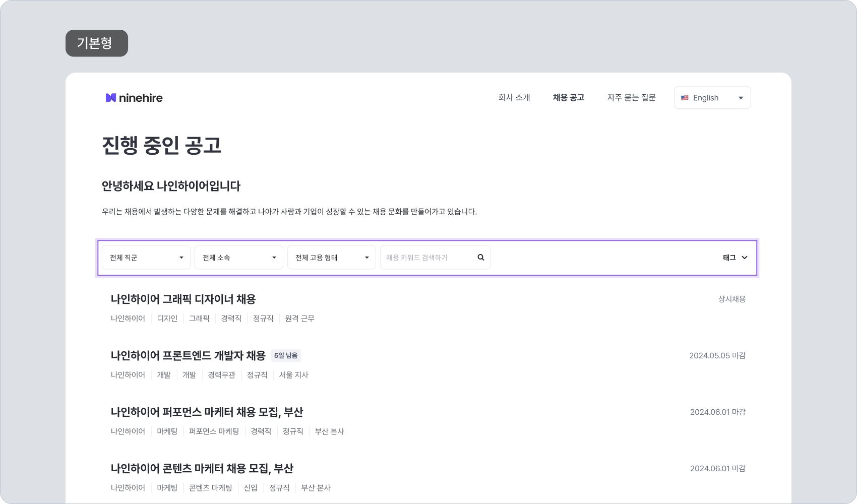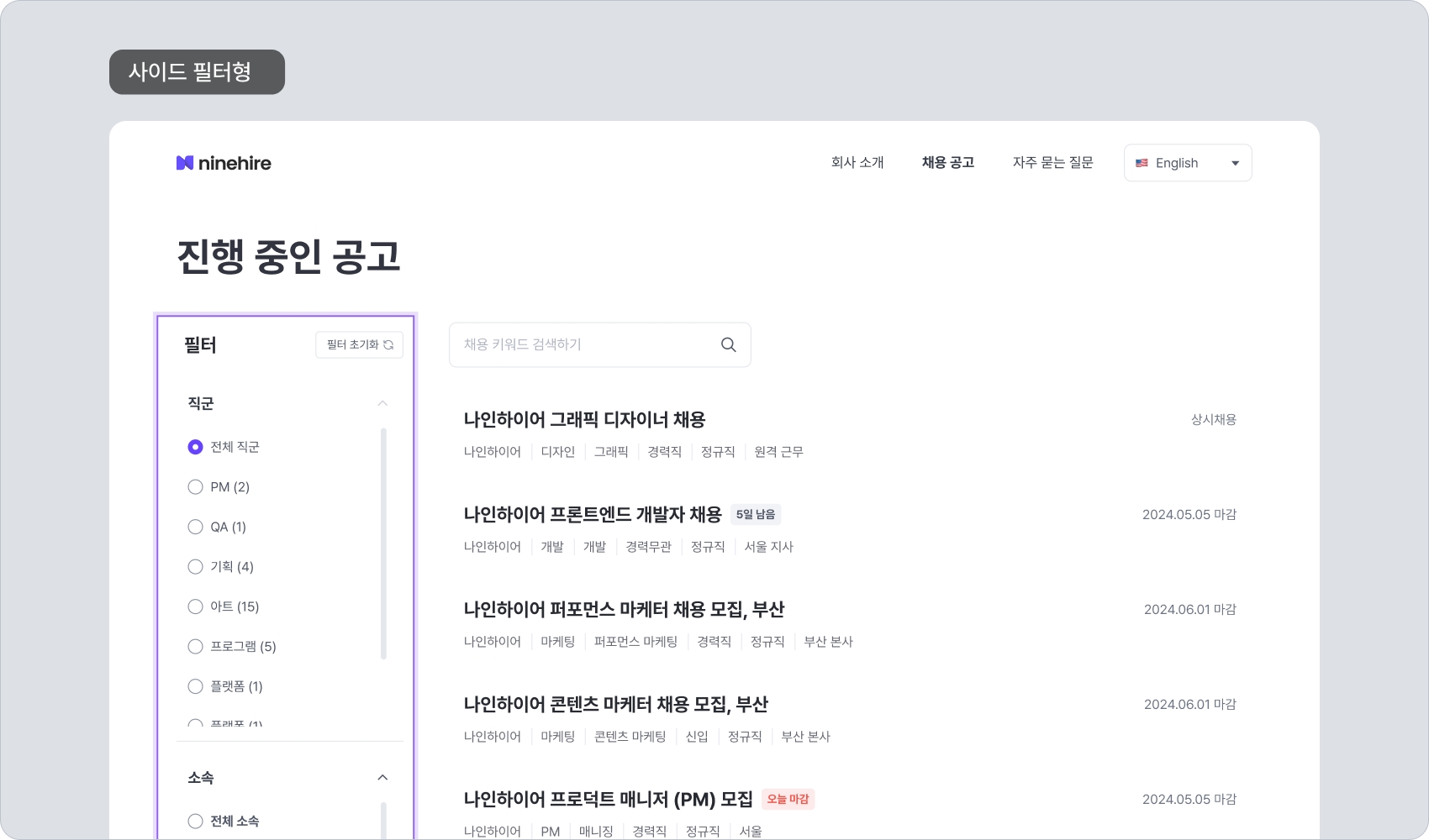 최신순 / 오래된 순: 나인하이어에 등록된 채용 생성일을 기준으로 정렬되어 공고 목록에 노출됩니다.