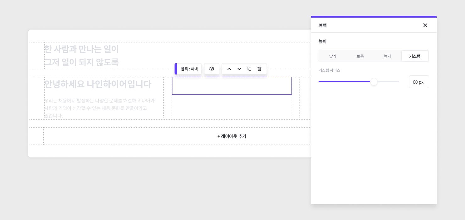 설정을 클릭하여 여백이 차지하는 세로 영역의 높이를 설정할 수 있습니다. 여백 높이는 낮게 / 보통 / 높게 중 하나를 선택하거나 커스텀 사이즈로 설정할 수 있습니다.