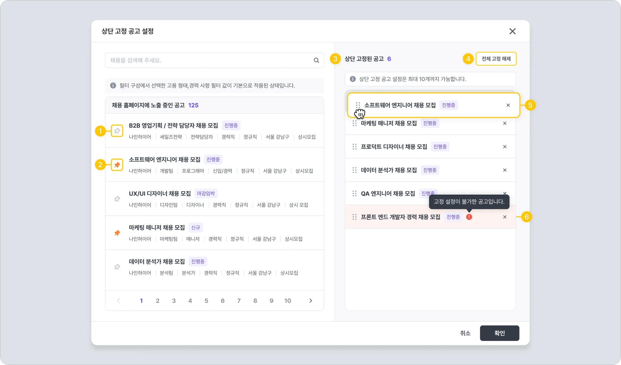 상단에 고정 노출하고 싶은 채용을 최대 10개까지 선택하여 고정할 수 있습니다.
