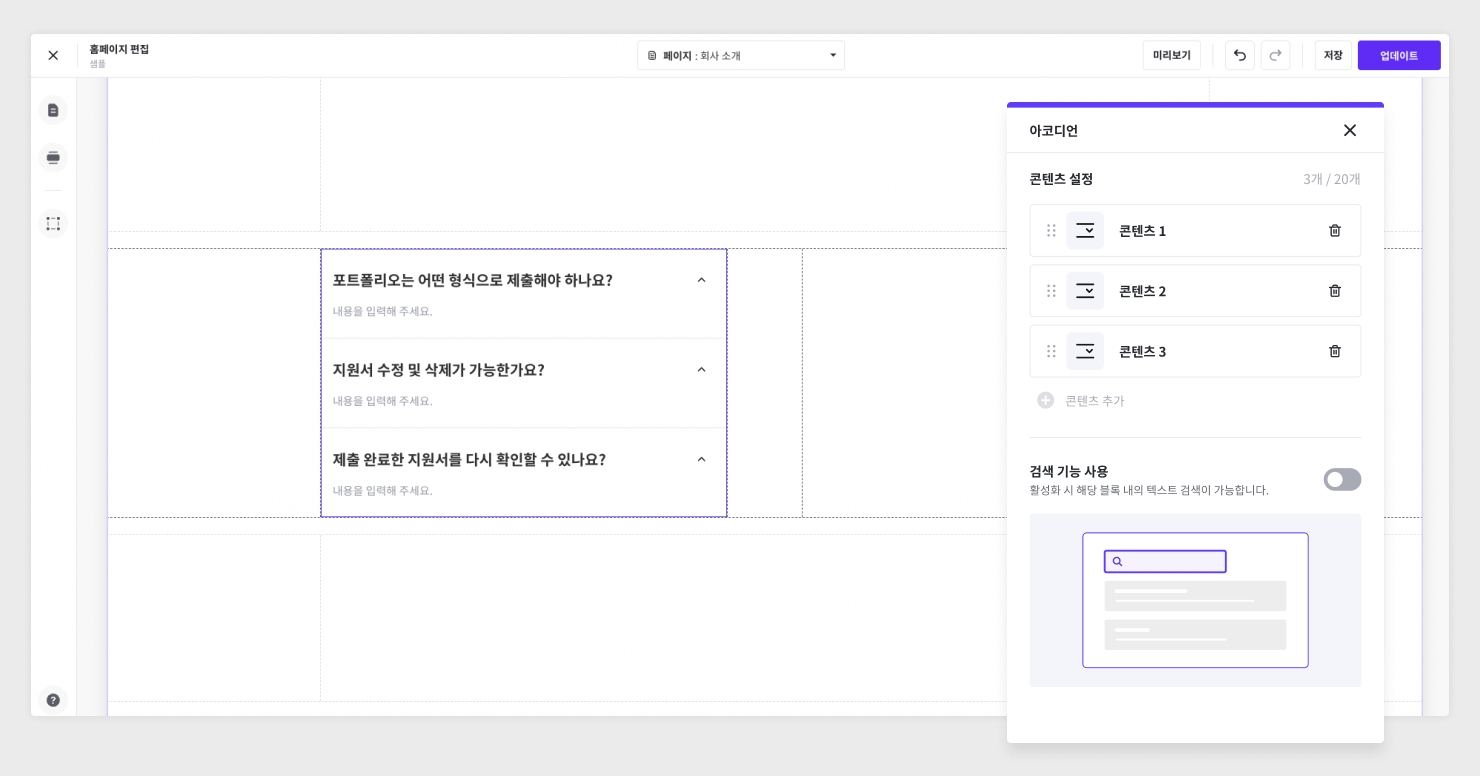 검색 기능 사용 : ON/OFF 가능 (해당 블록 내에서 텍스트 검색 여부)