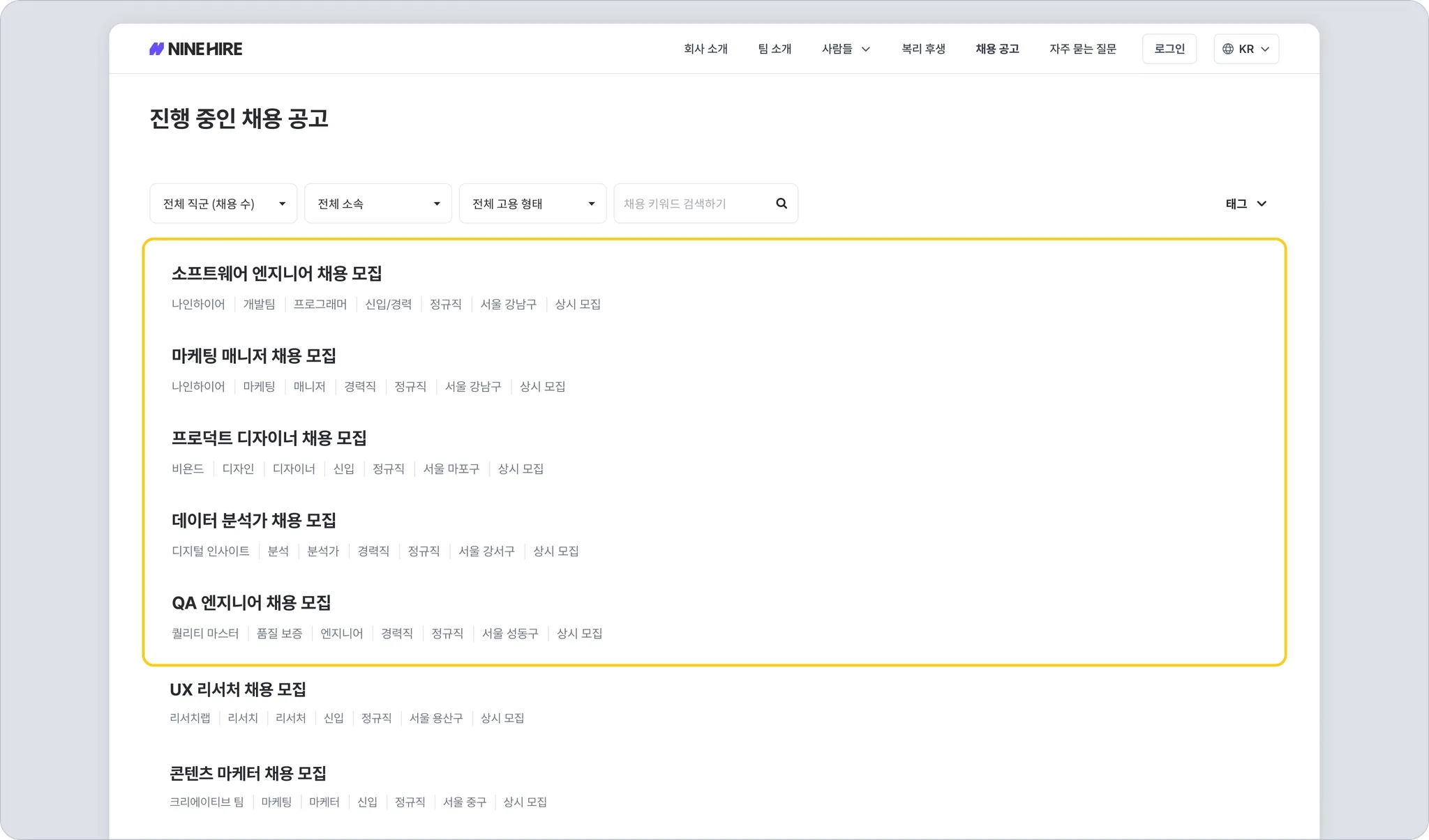 채용 공고 블록은 나인하이어 ATS 채용 관리 탭에서 생성하여 모집 시작 상태로 설정한 공고 리스트가 표시되는 블록입니다.