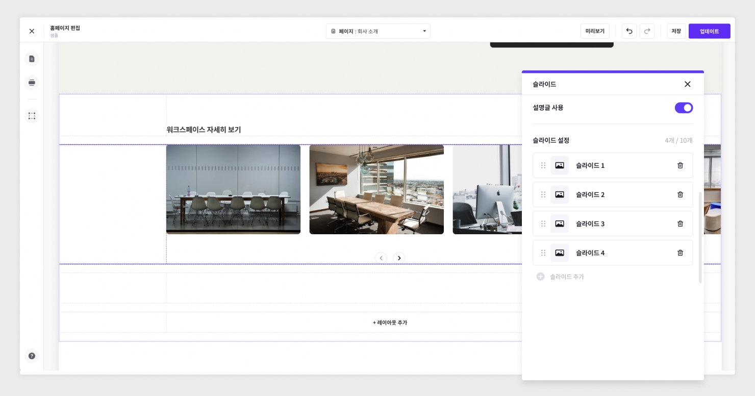 여러 이미지를 가로 방향의 슬라이드 형식으로 보여주고 싶을 때 사용하는 블록입니다. 이미지와 이미지 아래 텍스트(설명글)이 기본 구성입니다. 설정을 클릭하여 설명글 사용 여부를 설정할 수 있으며 슬라이드 이미지의 순서를 변경하거나 슬라이드를 추가할 수 있습니다. (최대 10개 슬라이드)