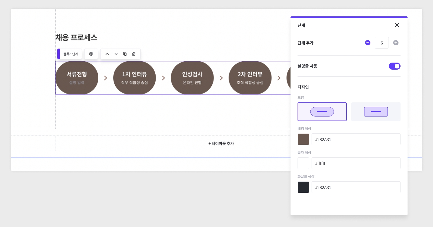 단계 추가 : 단계를 추가하거나 삭제할 수 있습니다. (삭제 시 가장 오른쪽 단계부터 삭제, 삭제 시 작성된 텍스트 데이터는 사라짐)