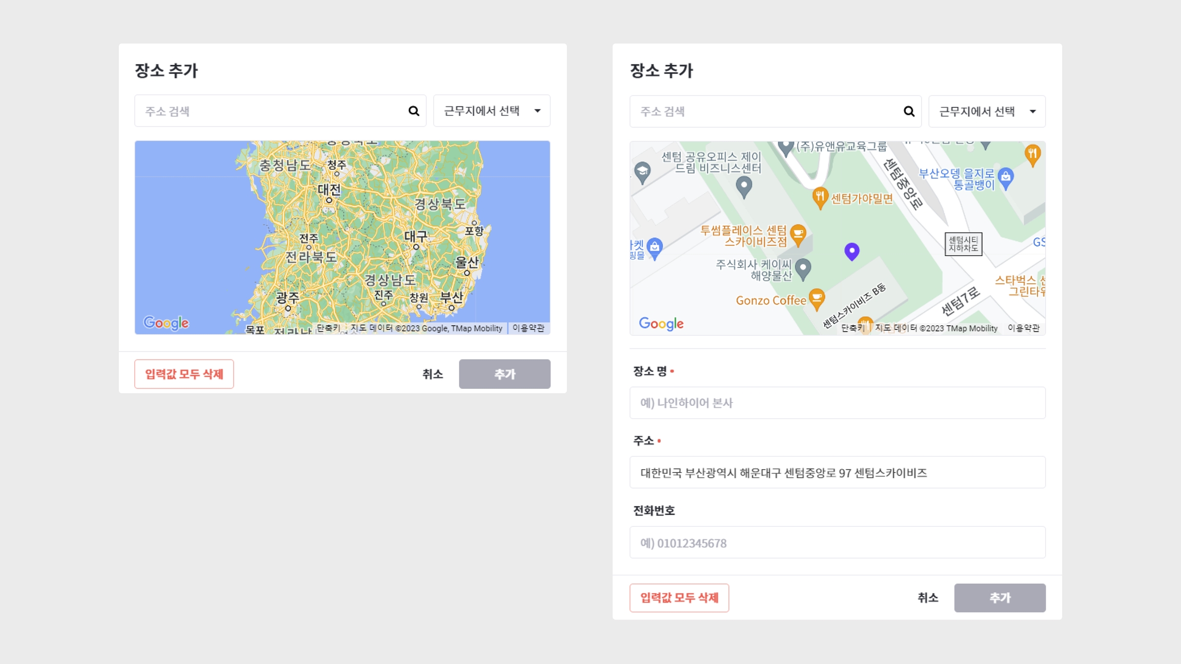 장소 추가 시 [주소 검색] 후에는 검색된 장소의 장소 명을 입력해야 합니다. 또한 세부 주소는 수정할 수 있습니다.