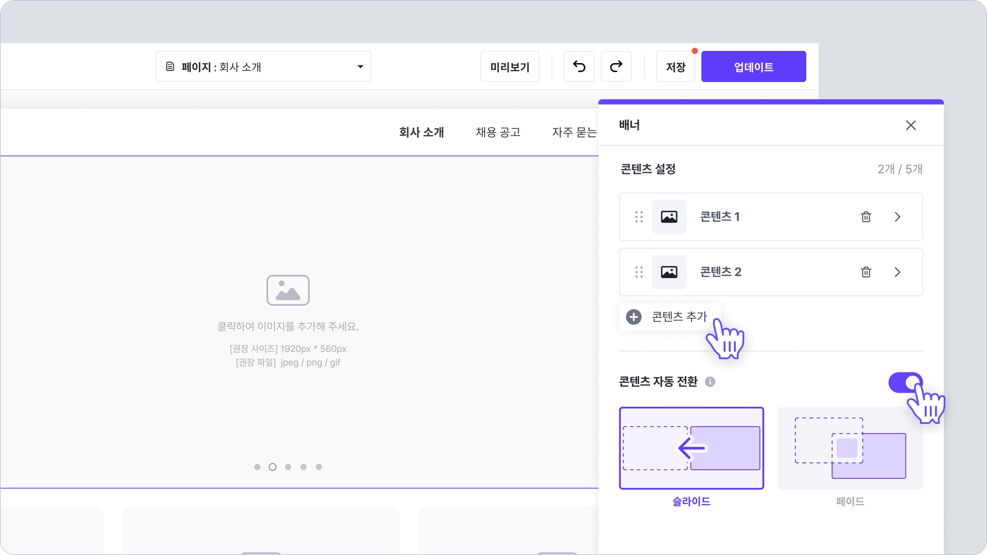 배너 이미지가 여러 장인 경우, 콘텐츠 자동 전환 버튼을 켜면 슬라이드 혹은 페이드 방식으로 자동 전환되도록 할 수 있습니다. 자동 전환 버튼을 끄면, 사용자가 배너 이미지 하단에 표시되는 버튼을 클릭하여 이미지를 이동시키도록 유도합니다.