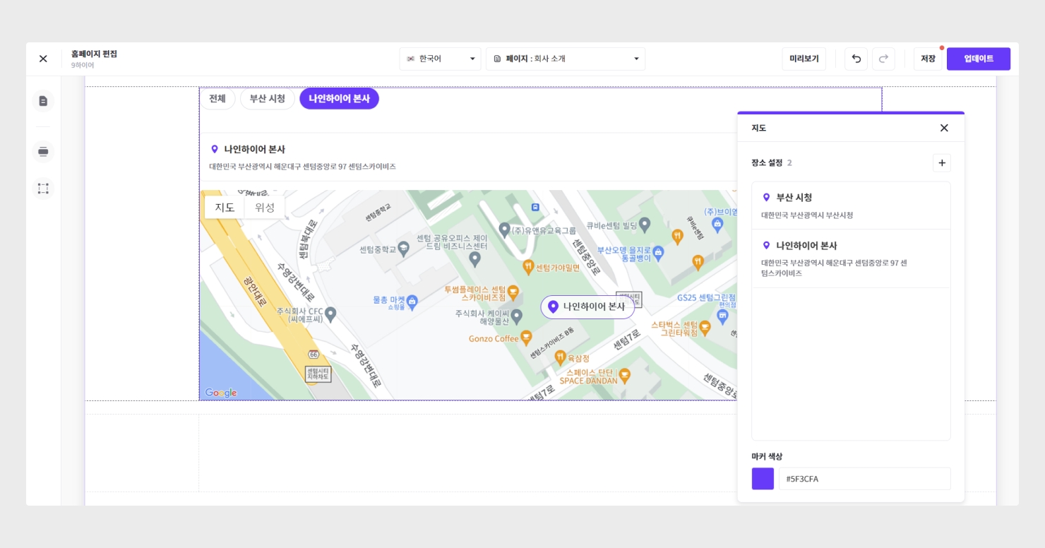 근무 장소를 안내하기 위해 사용할 수 있는 지도 블록입니다. 설정을 클릭하여 장소를 추가/수정/제거하거나 마커 색상을 변경할 수 있습니다.