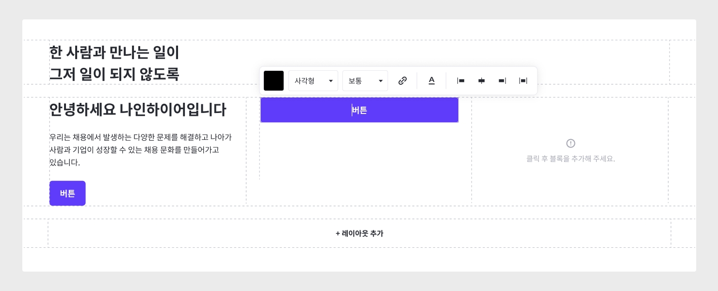 1~4단 레이아웃 모두에서 사용 가능한 블록 : 텍스트, 버튼, 드롭다운, 이미지, 구분선, 여백