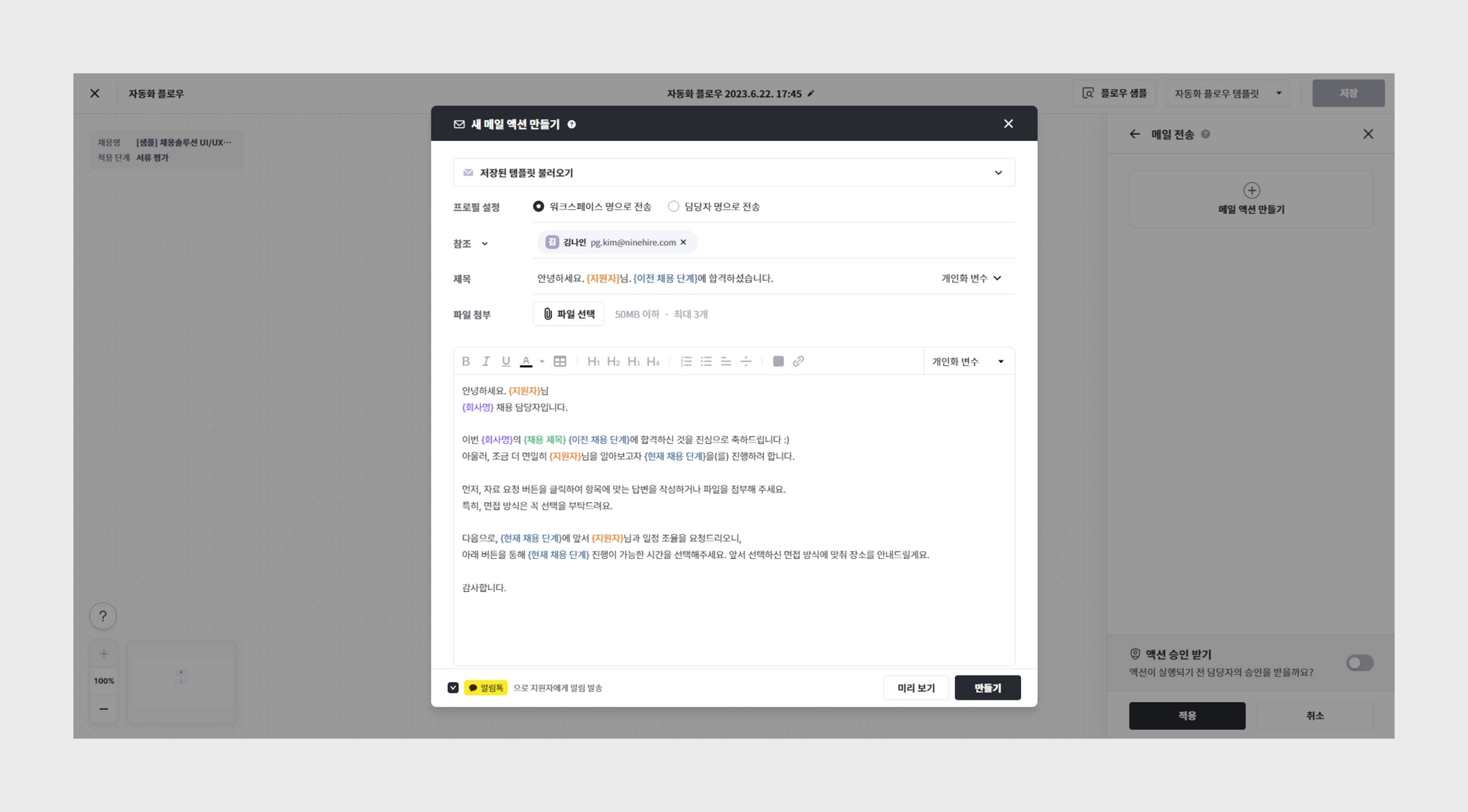 특정 상황이나 단계에서 반복적으로 전송되어야 할 메일은 메일 전송 액션을 추가하여 자동화해 보세요.