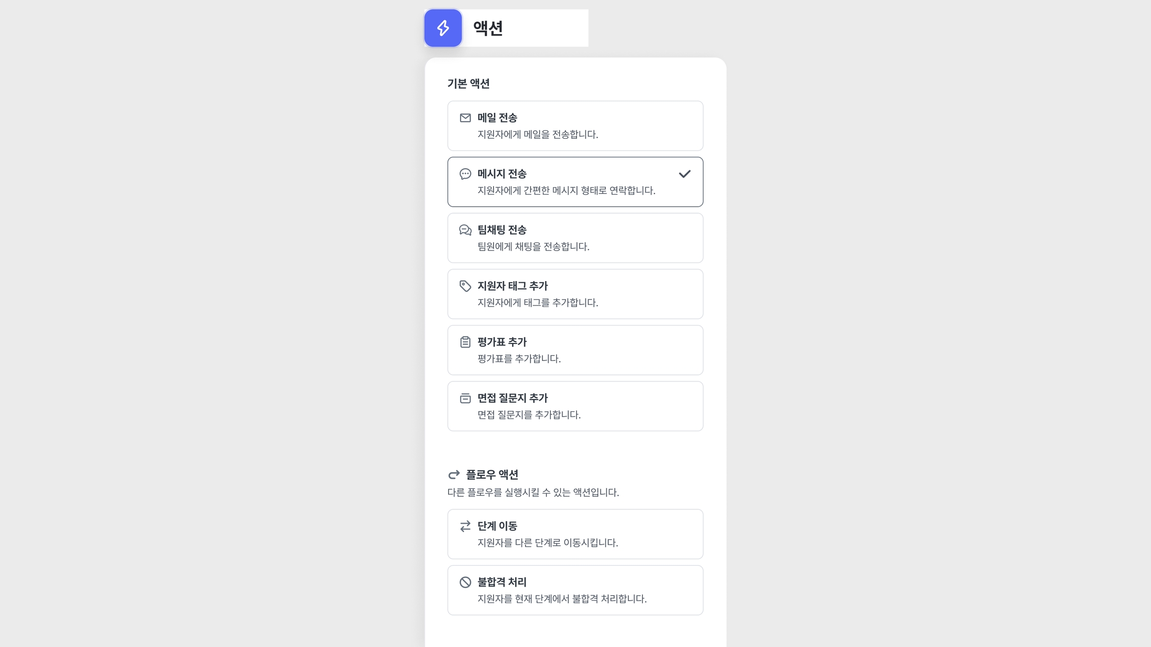해당 액션 다음에는 다른 카드를 더 추가할 수 없습니다.지원자의 단계가 이동되면, 해당 자동화 플로우가 더 이상 해당 단계에 속하지 않게 되기 때문입니다.