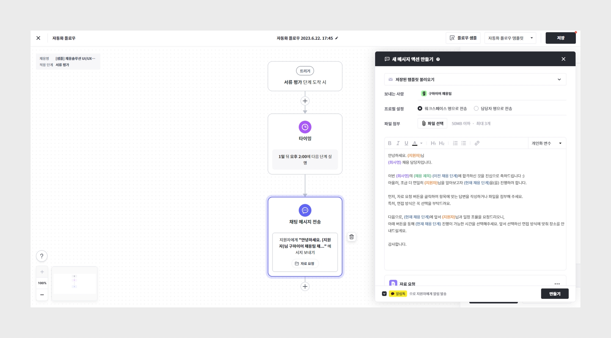 특정 상황에서 면접관이나 평가자에게 전달한 고정적인 메시지가 있나요? 팀채팅 전송 액션을 추가하여 자동화해 보세요.
