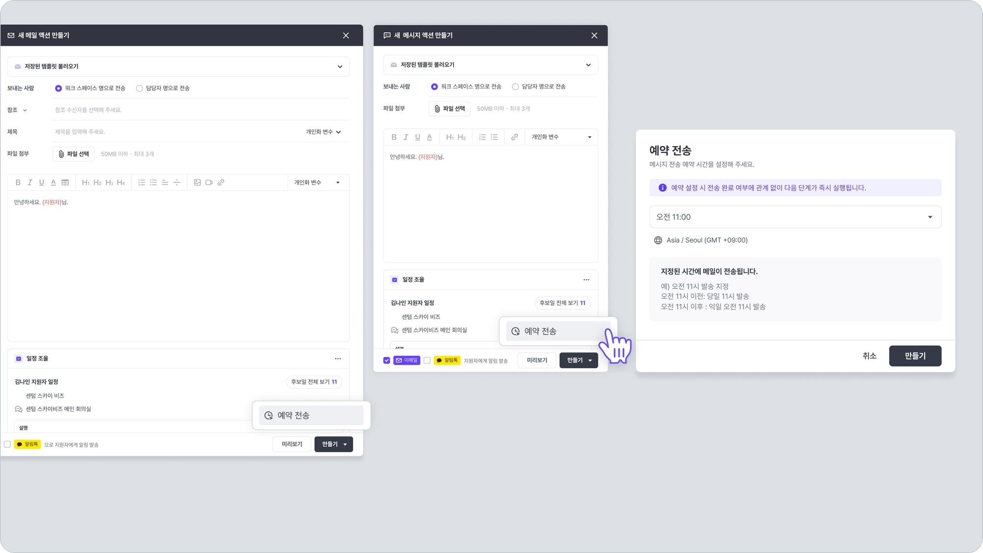 메일, 메시지 액션을 만들 때 우측 하단에 있는 만들기 버튼 우측 아래 방향 화살표 버튼(🔽)을 클릭하면 예약 전송 버튼이 나타납니다.