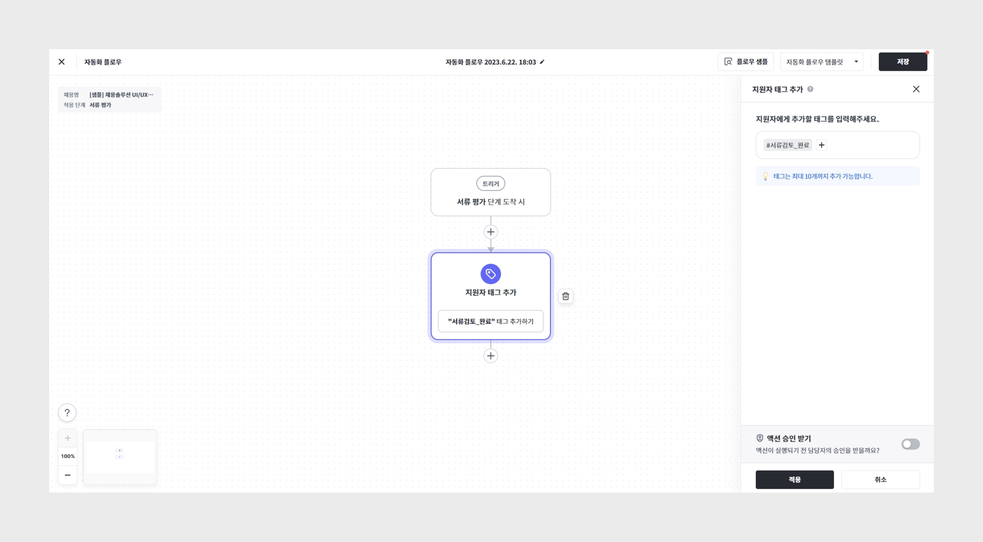 지원서 값이나 평가 결과, 과제 제출 유무 등을 지원자 태그를 추가하여 표시하고 싶다면, 지원자 태그 추가 액션을 추가해 보세요.