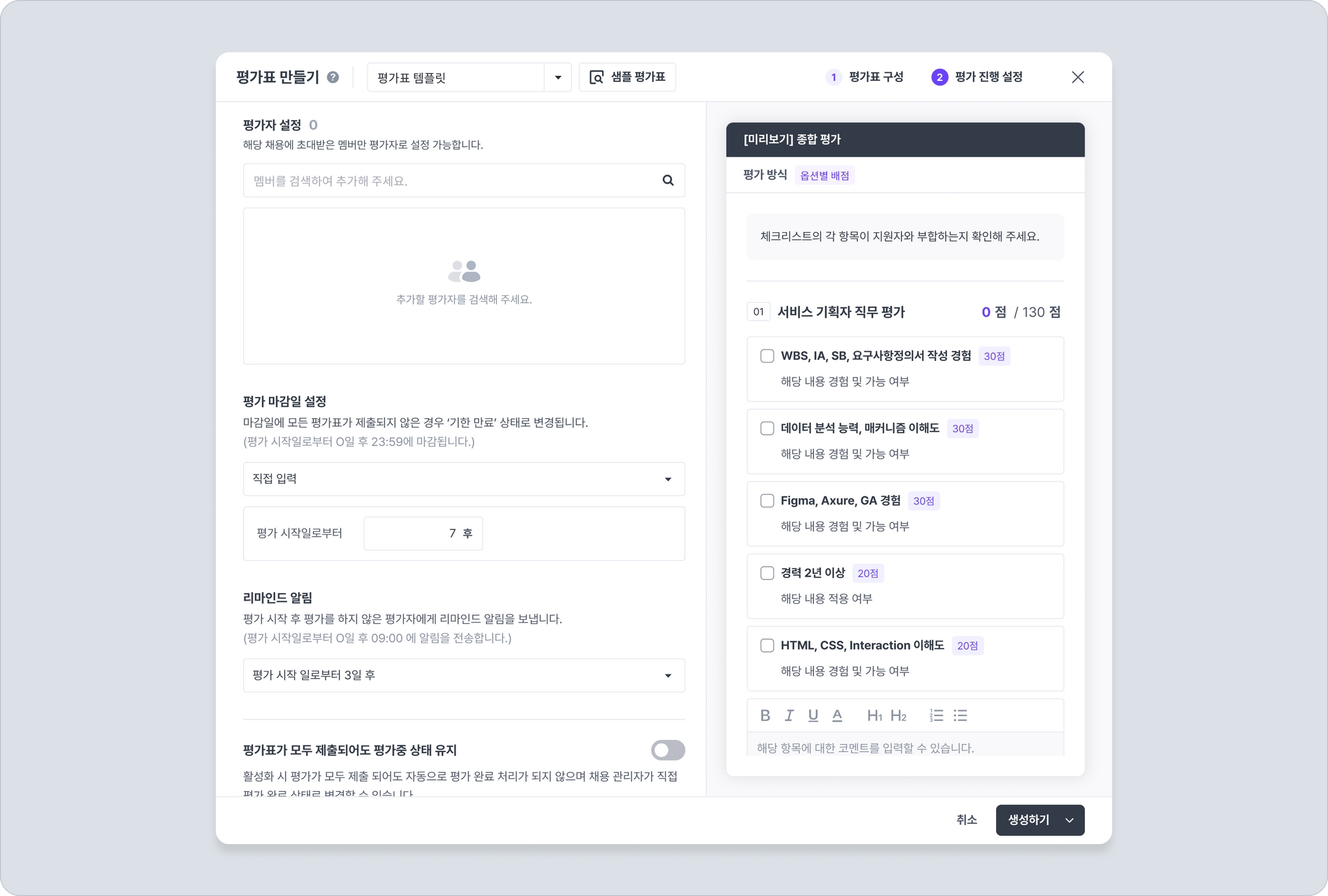 평가자를 설정하고, 평가 마감일, 리마인드 알림을 설정합니다. 자동 평가 시작 여부도 설정할 수 있습니다. (평가 진행 설정 단계)