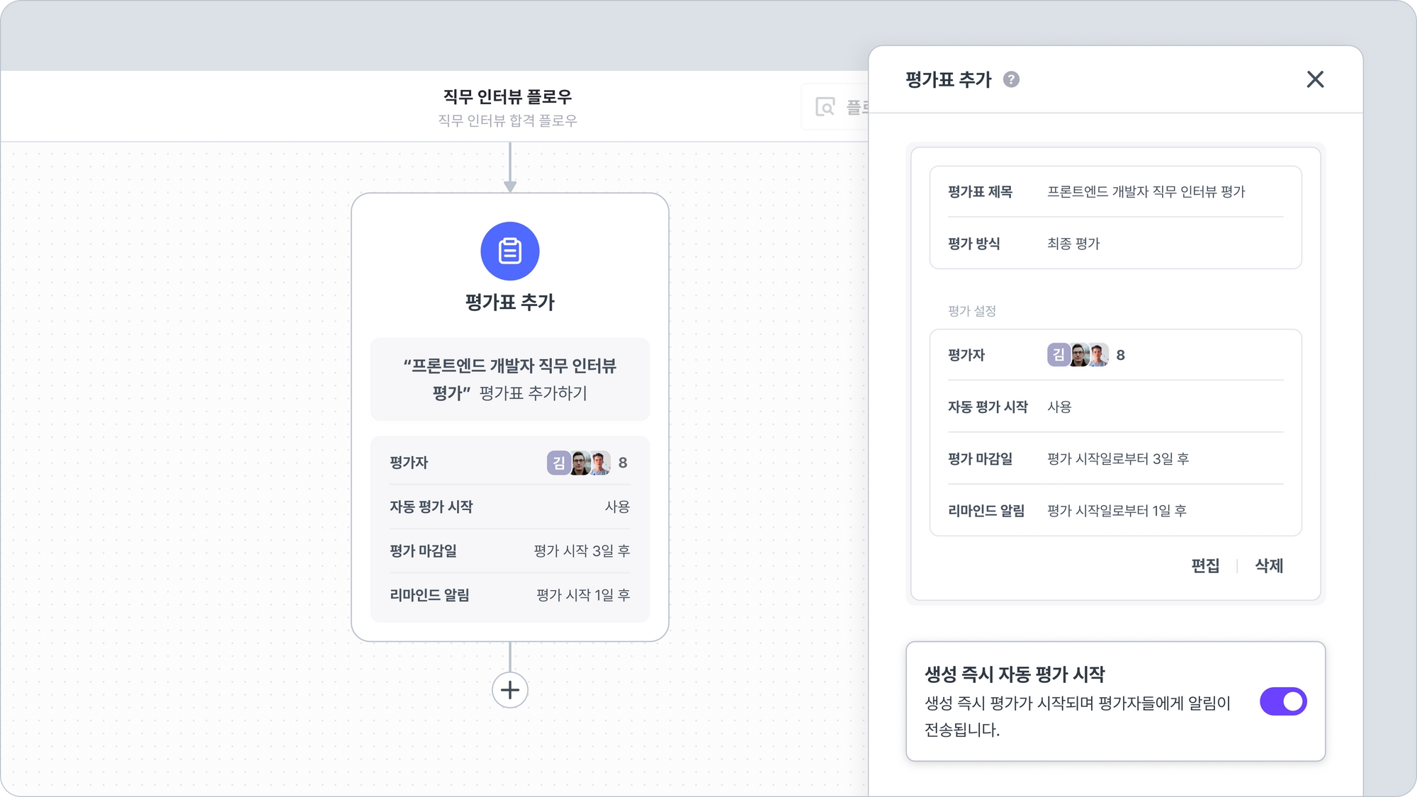 “생성 즉시 자동 평가 시작” 버튼을 켜면, 평가표가 자동으로 추가됨과 동시에 평가가 시작되어 설정된 평가자에게 평가 요청 알림이 전송됩니다.