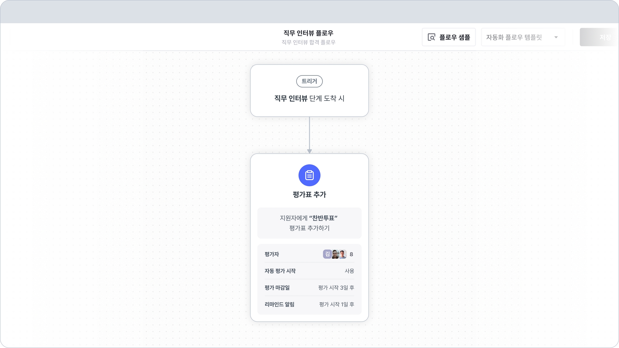 설정된 평가자가 채용 참여자에서 제외(내보내기/나가기)되더라도, 자동화 액션 실행 시 해당 평가표의 평가자 명단에는 그대로 유지되어 평가표가 생성됩니다.