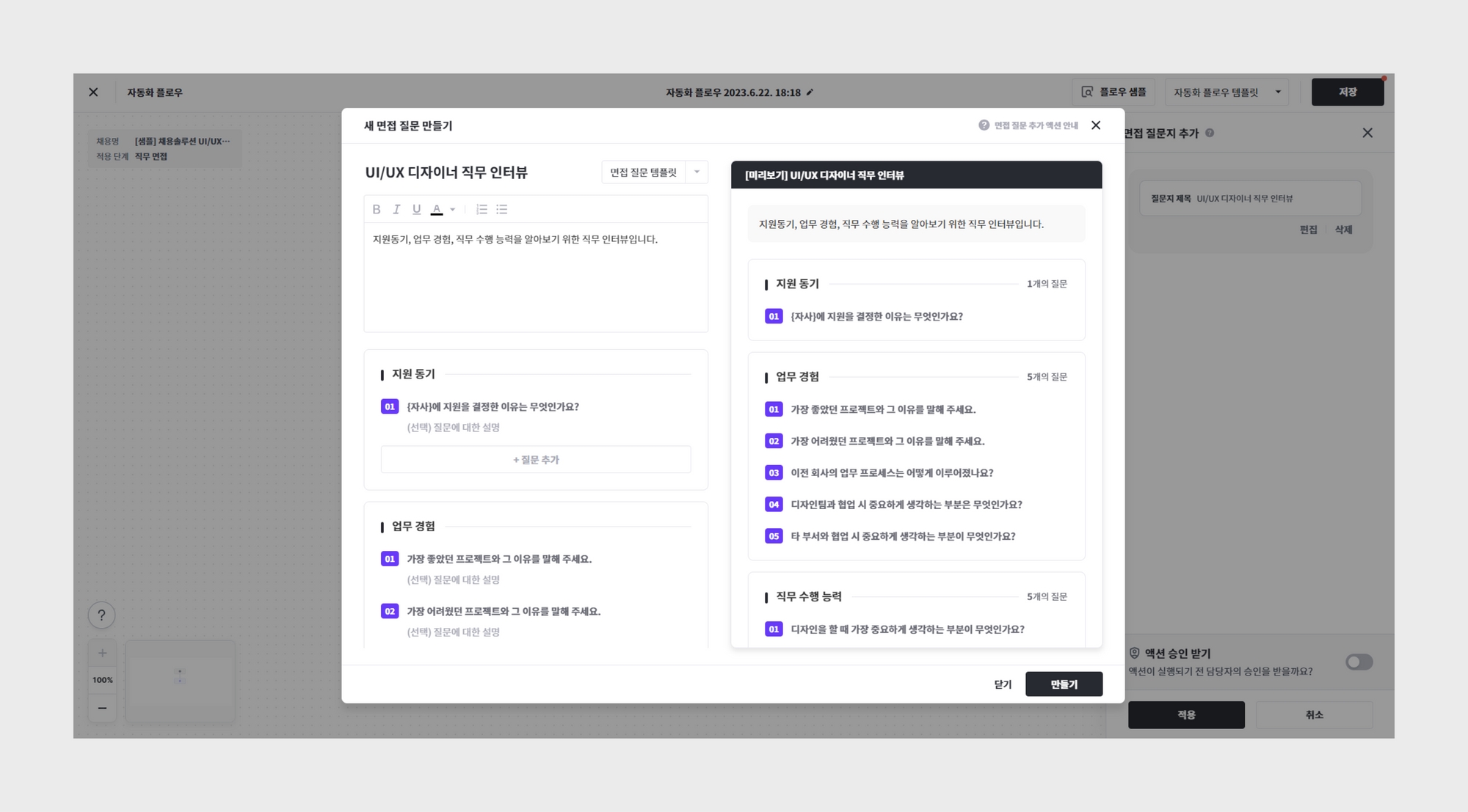 지원자 면접 때 활용해야 할 면접 질문지도 자동으로 추가해 둘 수 있습니다.