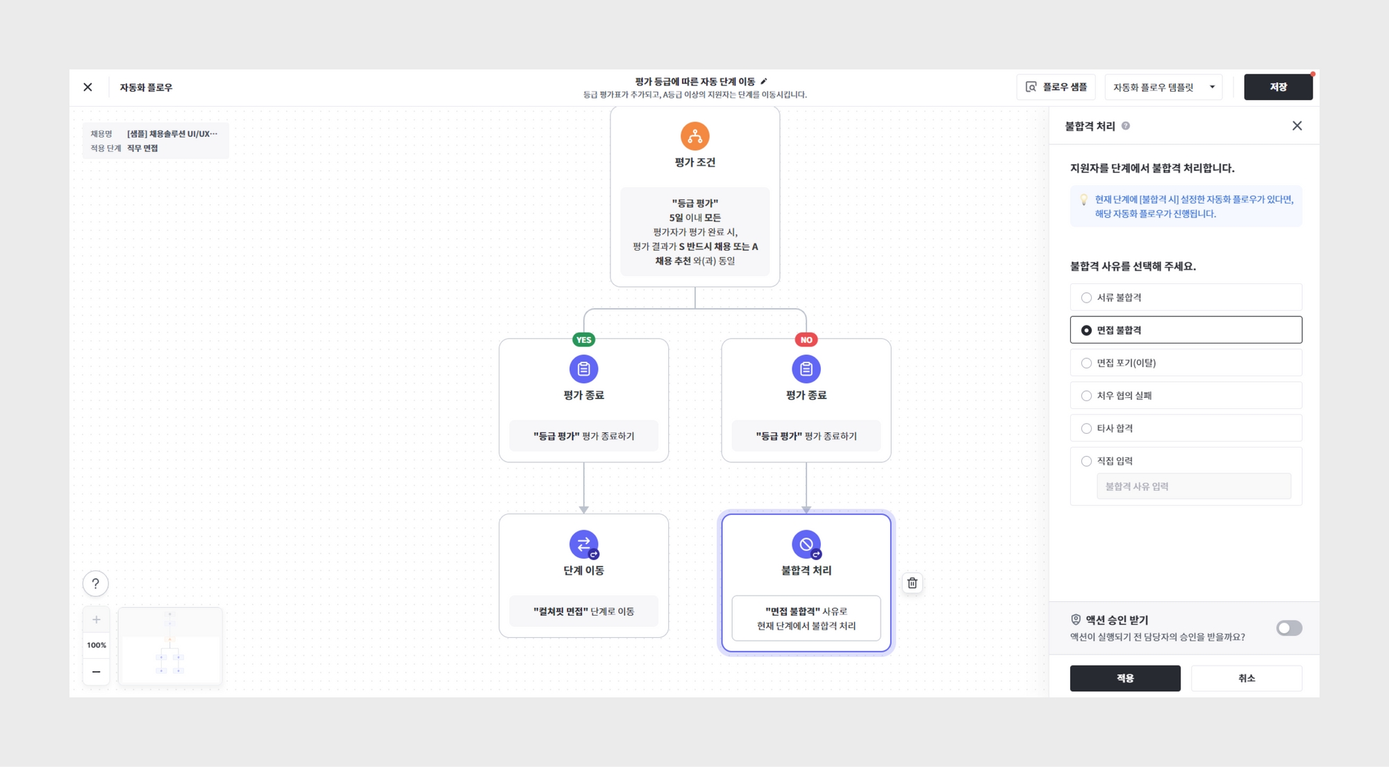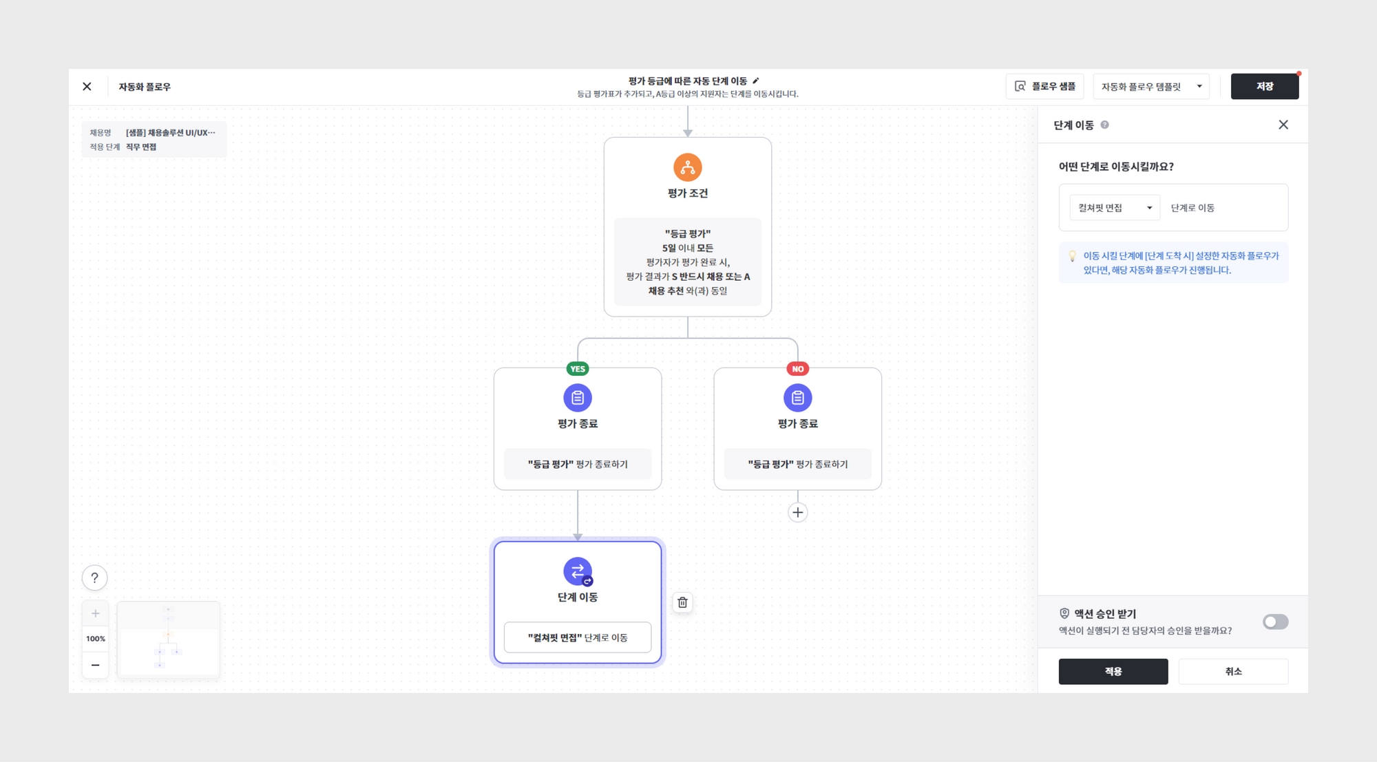 지원서나 평가 결과 값에 따라 지원자 합격 처리(단계 이동)를 자동화할 수 있습니다.