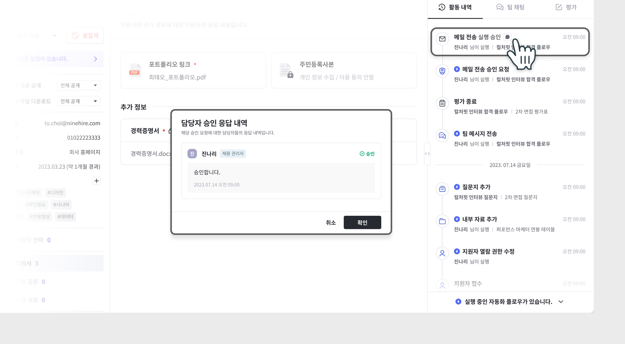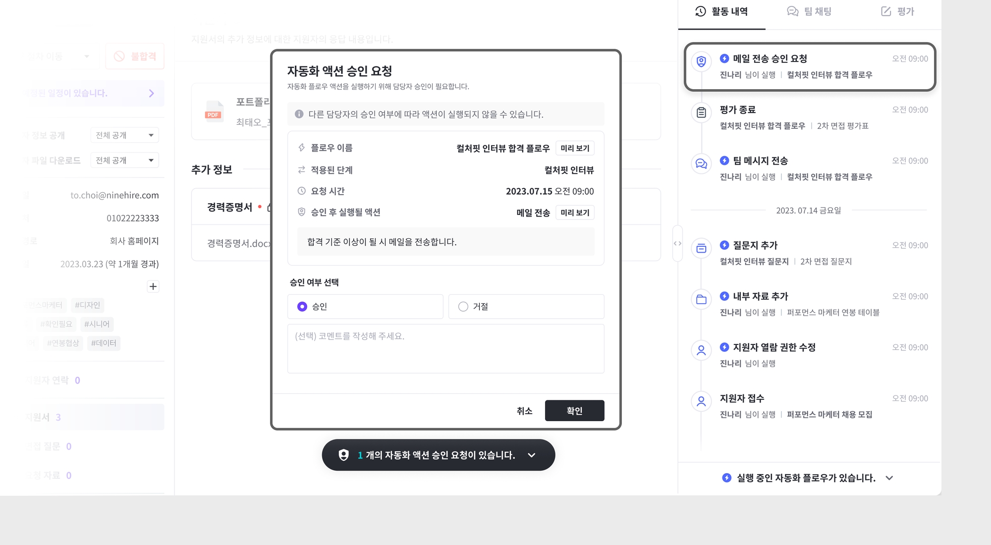 승인이 필요한 액션에 도착하면 승인이 요청됩니다. 승인 요청 알림은 위에서 설정한 승인 담당자에게 발송되며, 활동 내역에도 기록됩니다.