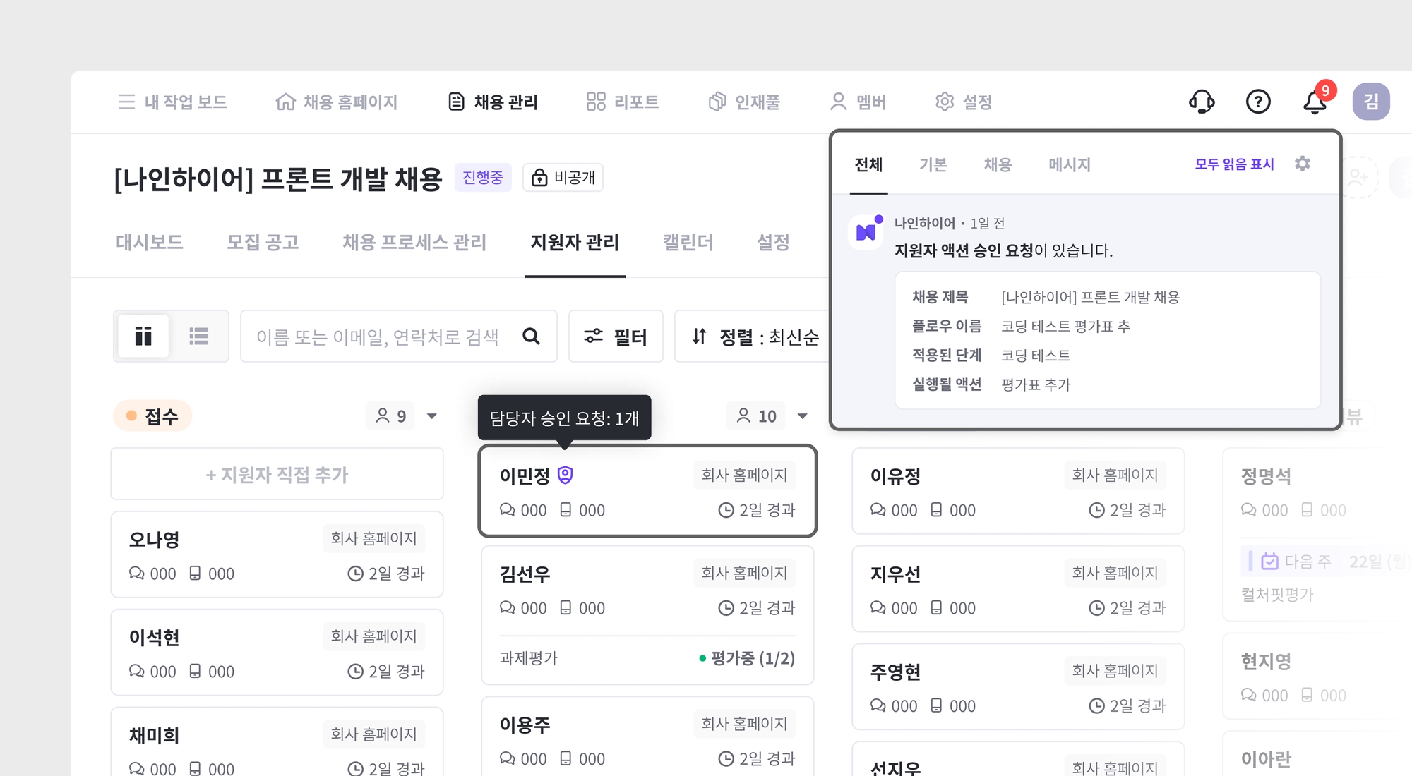 승인이 가능한 담당자는 각 채용의 채용 관리자 권한입니다.