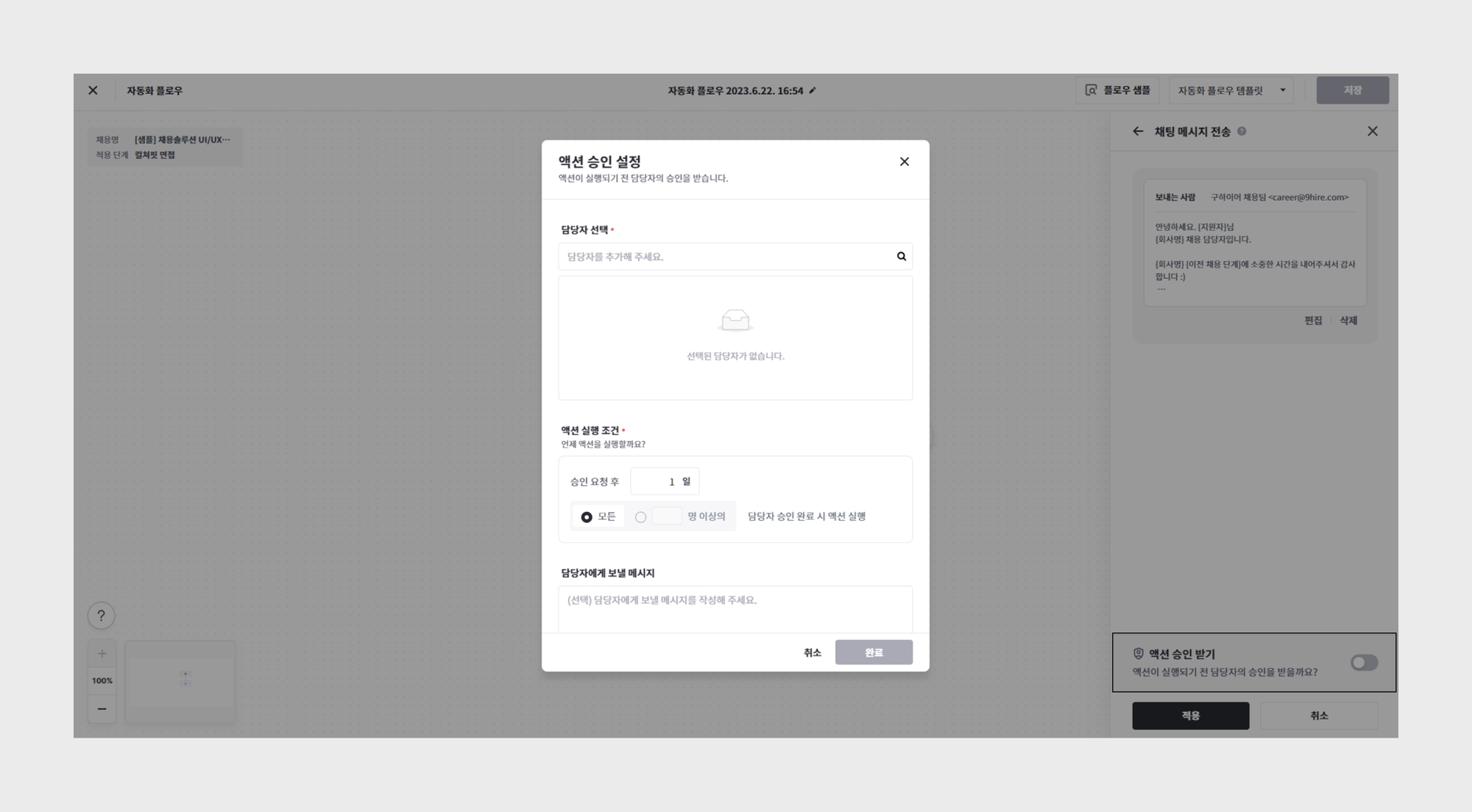 각 액션들의 설정 창(우측)의 하단에 위치한 "액션 승인 받기" 기능을 켭니다. 담당자를 선택하고, 액션 실행 조건을 설정합니다. “승인 요청 후 n일 이내, 모든/n명 이상의 담당자 승인 완료 시 액션 실행”을 조건으로 사용합니다. 담당자에게 보낼 메시지도 미리 작성해 둘 수 있습니다.